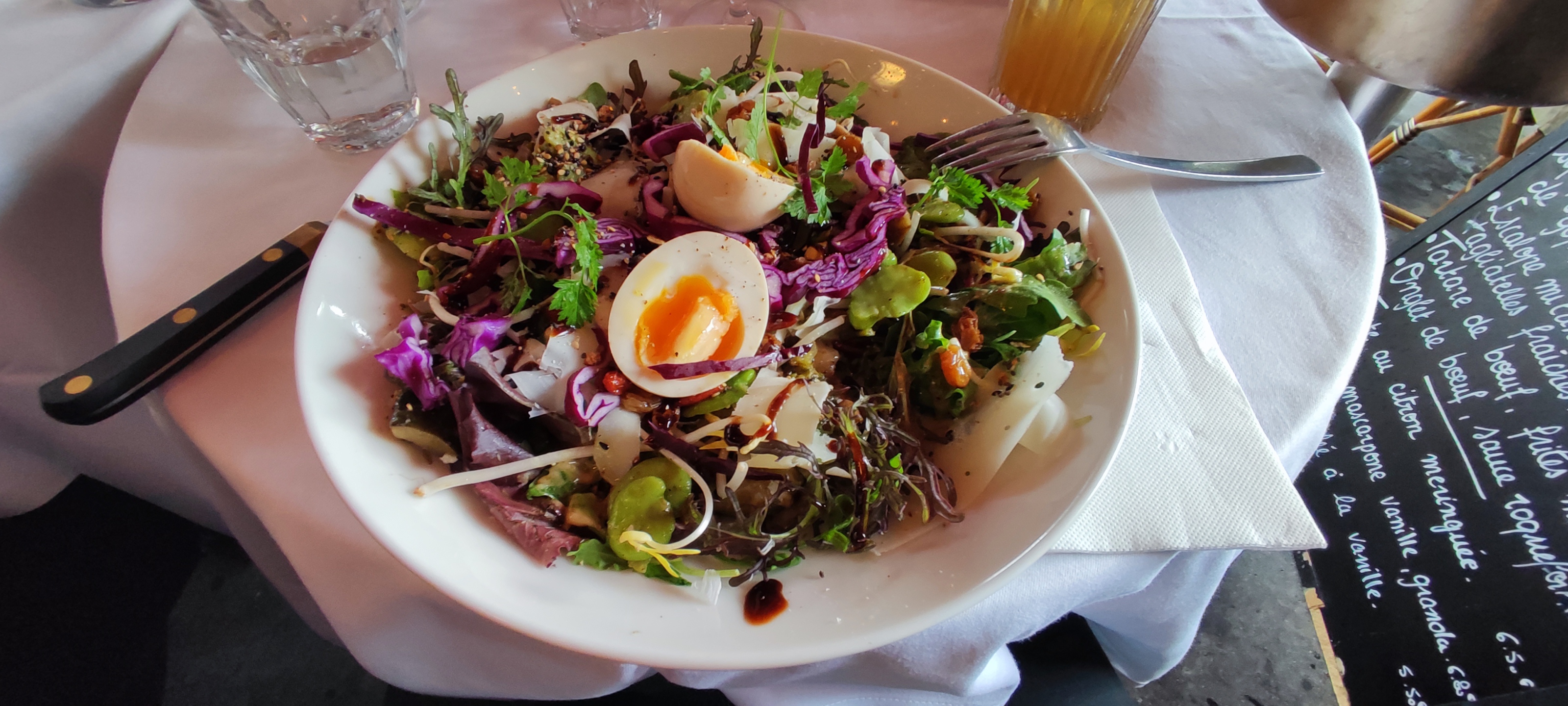 Sur la terrasse au soleil Entrée oeuf mayonnaise simple et délicieux Salomé est adorable Tout est bon Le pain est top L ambiance D un restaurant de quartier Bienveillant avec des supers produits