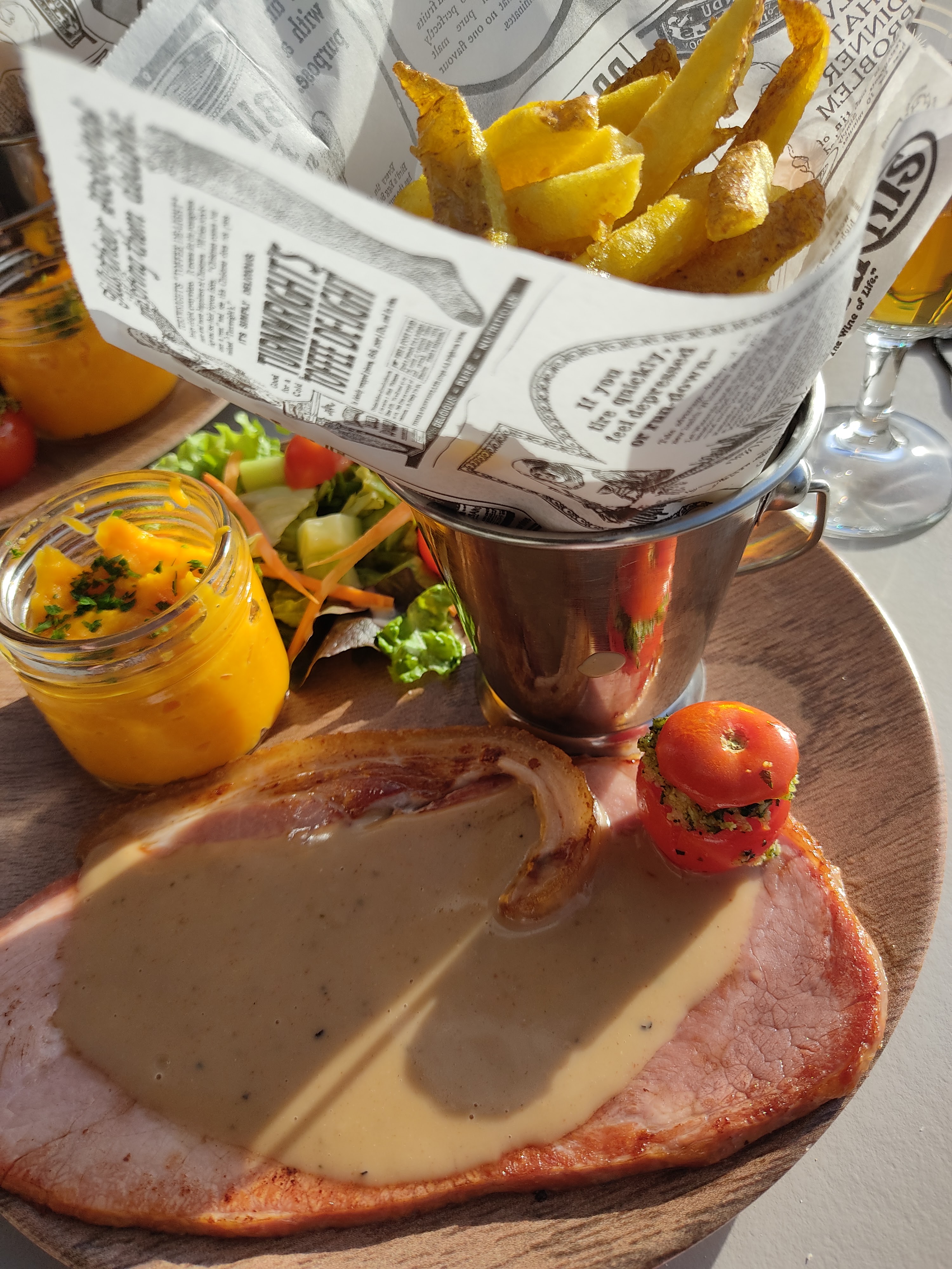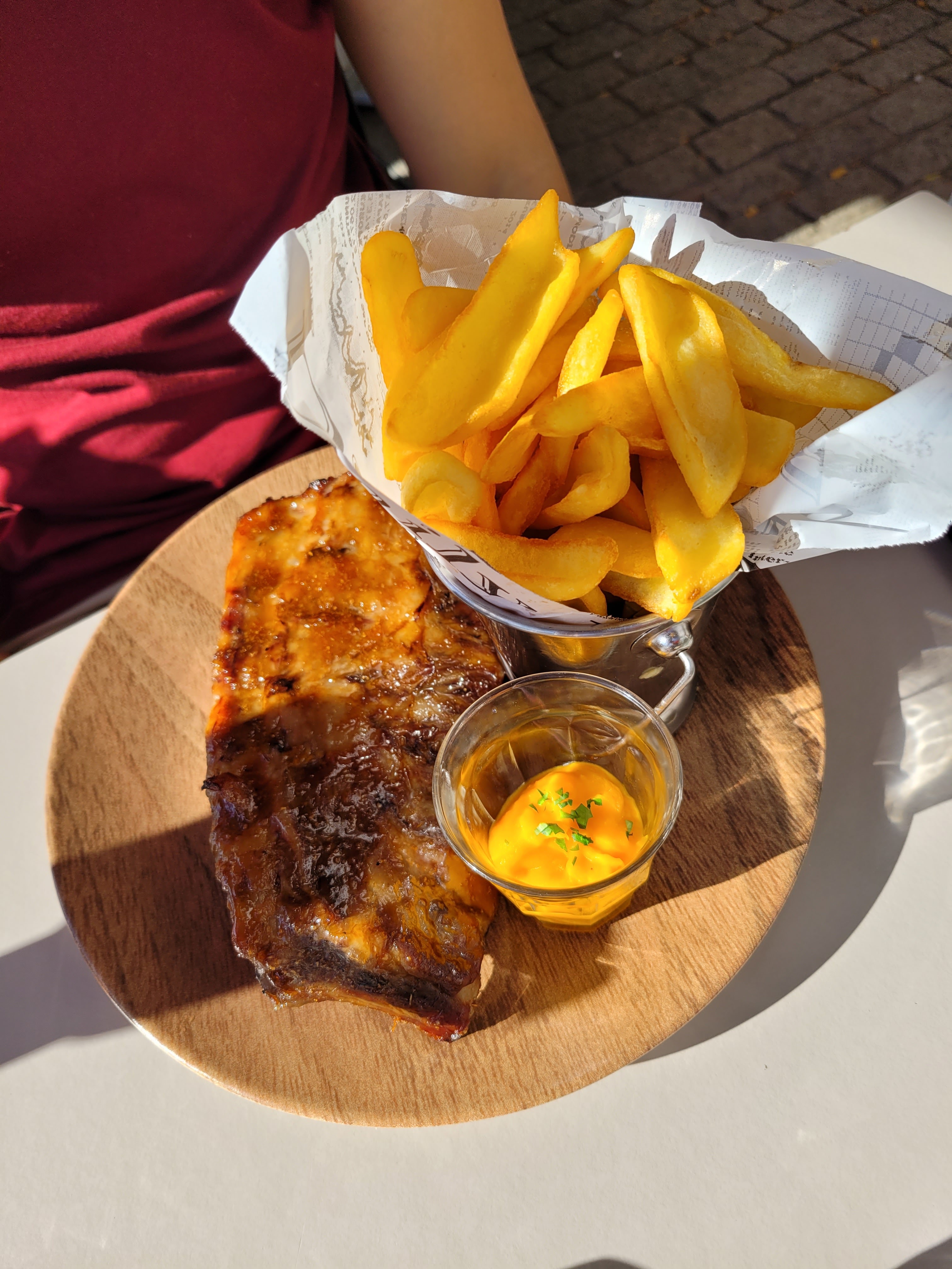 En parcourant la ville pour découvrir les différents quartiers de Bayonne, nous avons vu l'ardoise du jour de ce restaurant. Le menu nous a plu, le prix était raisonnable et la terrasse semblait très agréable. Nous nous sommes régalées : belle salade très fraîche avec des crevettes et des chipirons, ribs caramélisés et délicieuses profiteroles au chocolat. Une très belle surprise sur une place au soleil de l'autre côté de l'Adour, un peu à l'écart des restos semblant plus touristiques... Une adresse à recommander avec un excellent rapport qualité-prix.