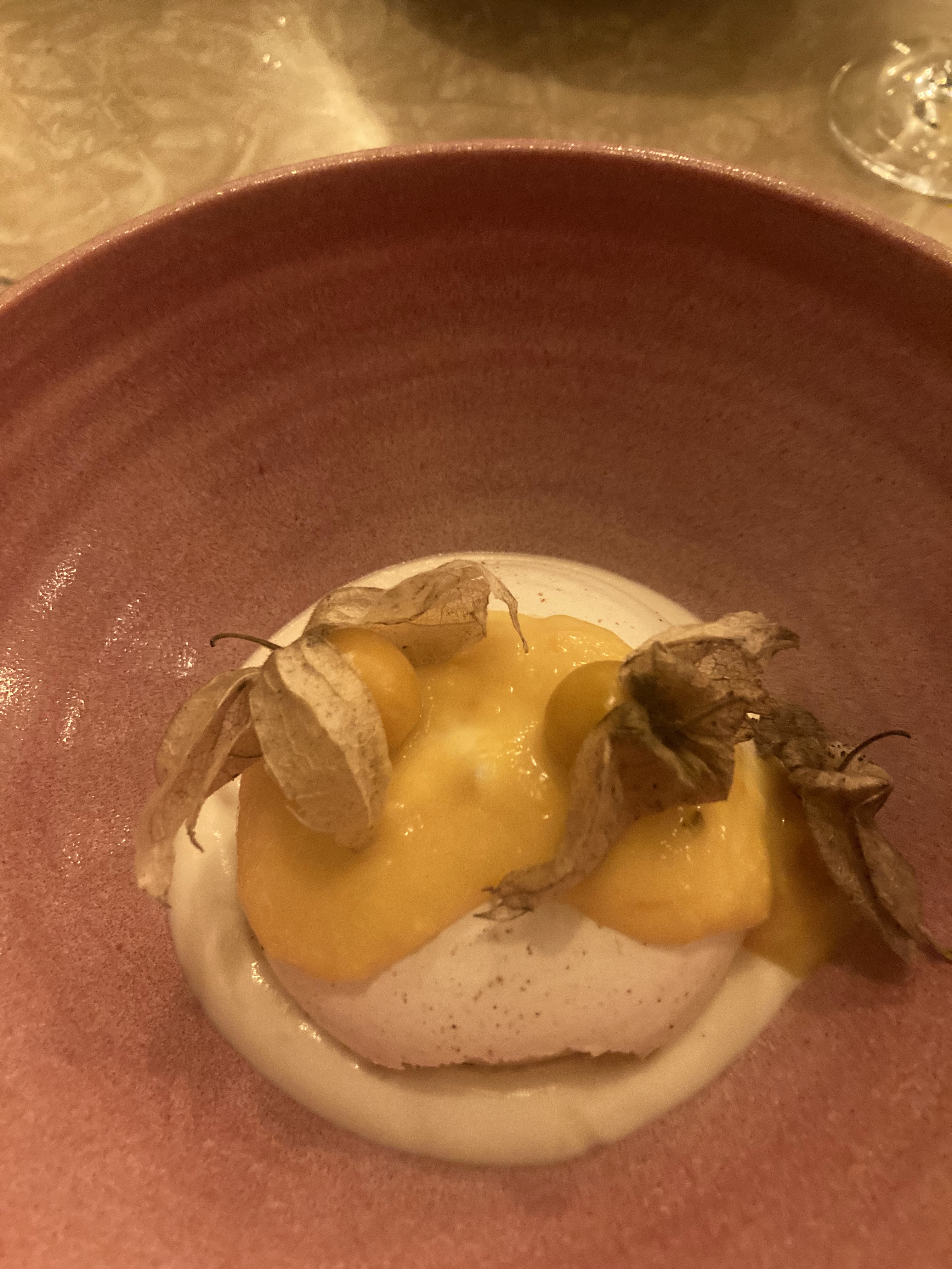 Excellente cuisine et très bon service. Malheureusement; endroit un peu trop bruyant, trop éclairé et pas assez confortable (tables étroites, petites chaises et banquettes de bistrot incommodes pour un repas de deux heures) pour pouvoir apprécier la dégustation. Sur la photo, la pavlova sauce à l'orange. Une meringue moelleuse. Excellente.