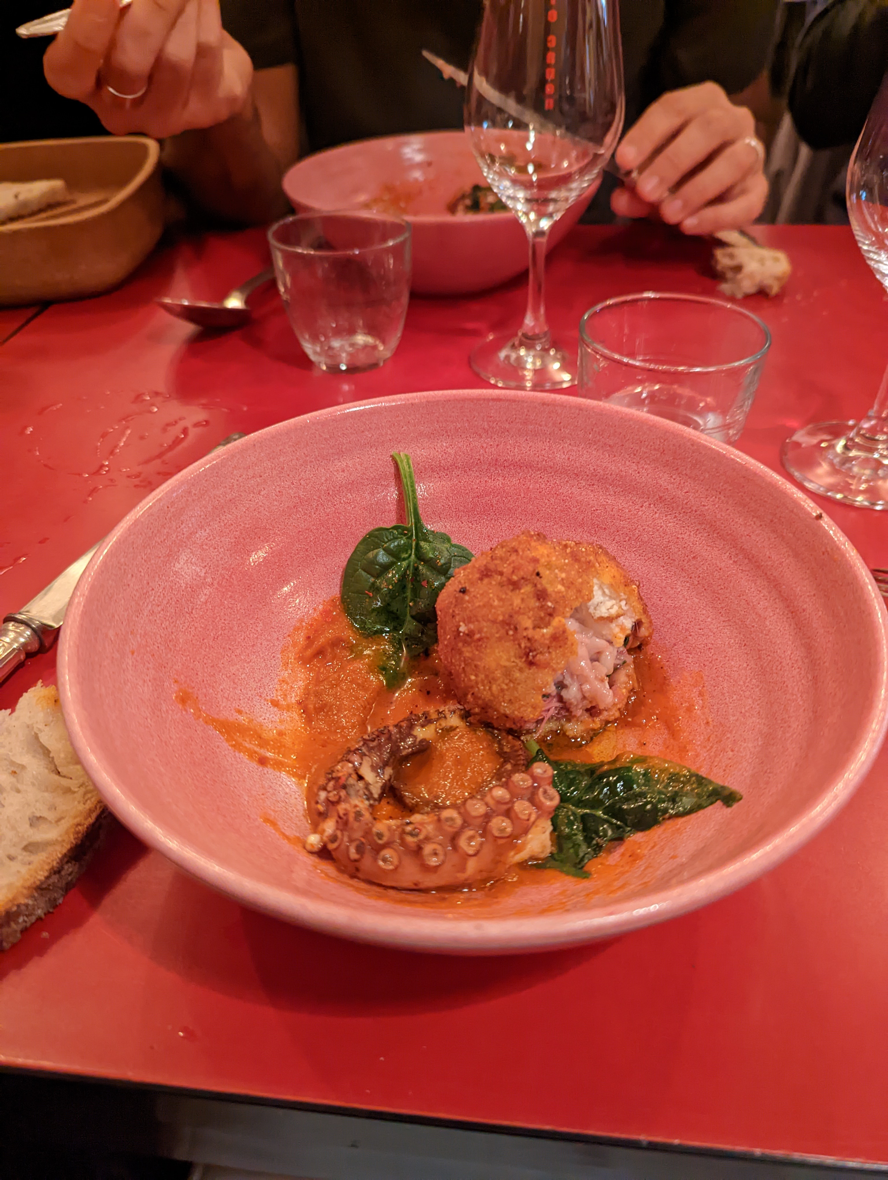 Ce que j'ai commandé était un gigot d'agneau qui était censé avoir un peu de poulpe à côté, mais à la place j'ai eu du poulpe avec un peu d'agneau à côté. Je m'attendais donc à ce que mon plat principal soit de la viande rouge, mais finalement ce sont des fruits de mer. Je pense que le problème ici est qu’ils n’ont pas de menu en anglais et que le serveur n’est pas très désireux d’expliquer clairement en anglais quelle est la nourriture. Donc, comme moi, vous pourriez finir par avoir quelque chose auquel vous ne vous attendez pas.