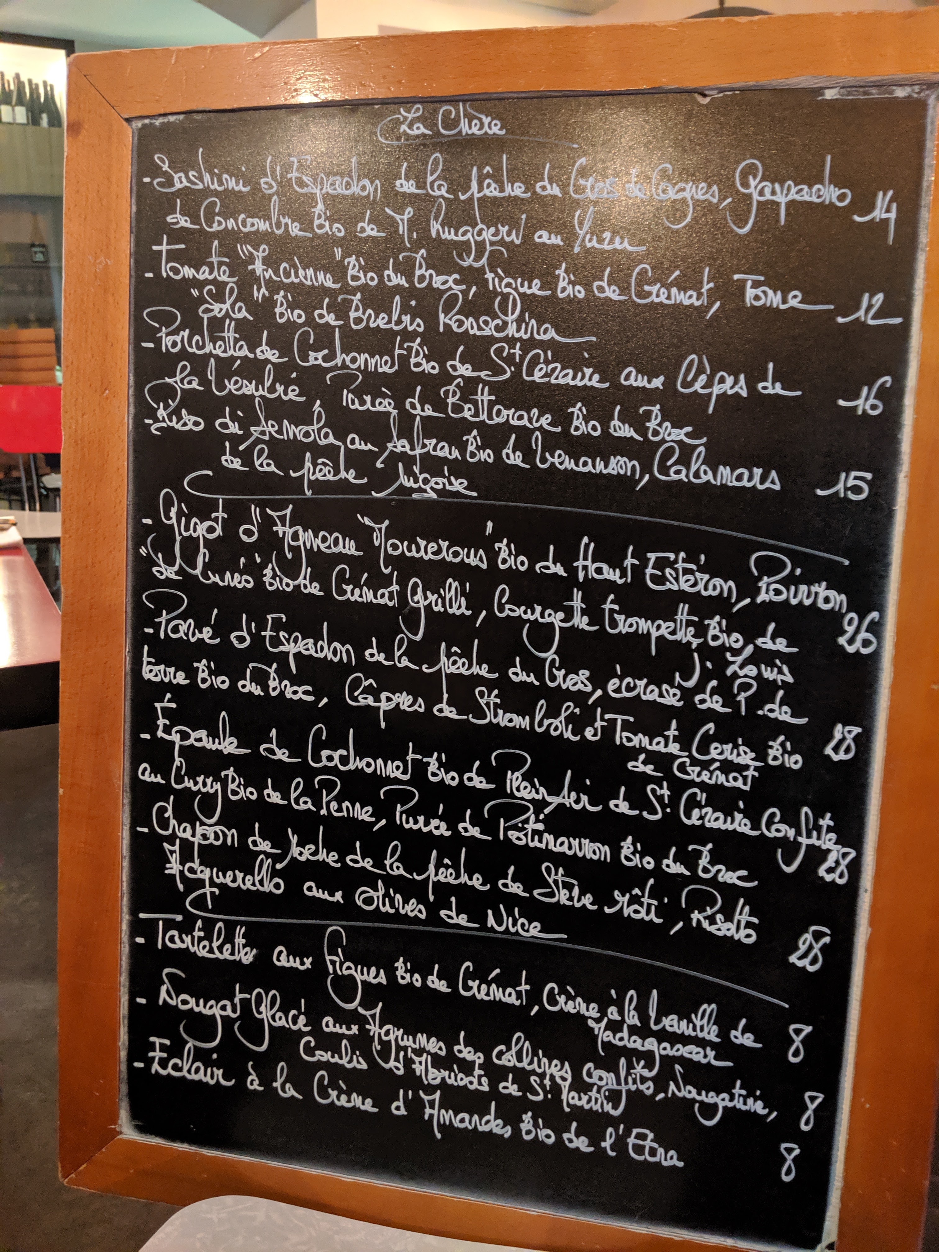 Une carte qui change tout les jours en fonction des arrivages d'une fraîcheur et d'une qualité impressionnante. Tout ça accompagné d'un vin nature sélectionné avec soin par le patron. De quoi passer un très bon repas.