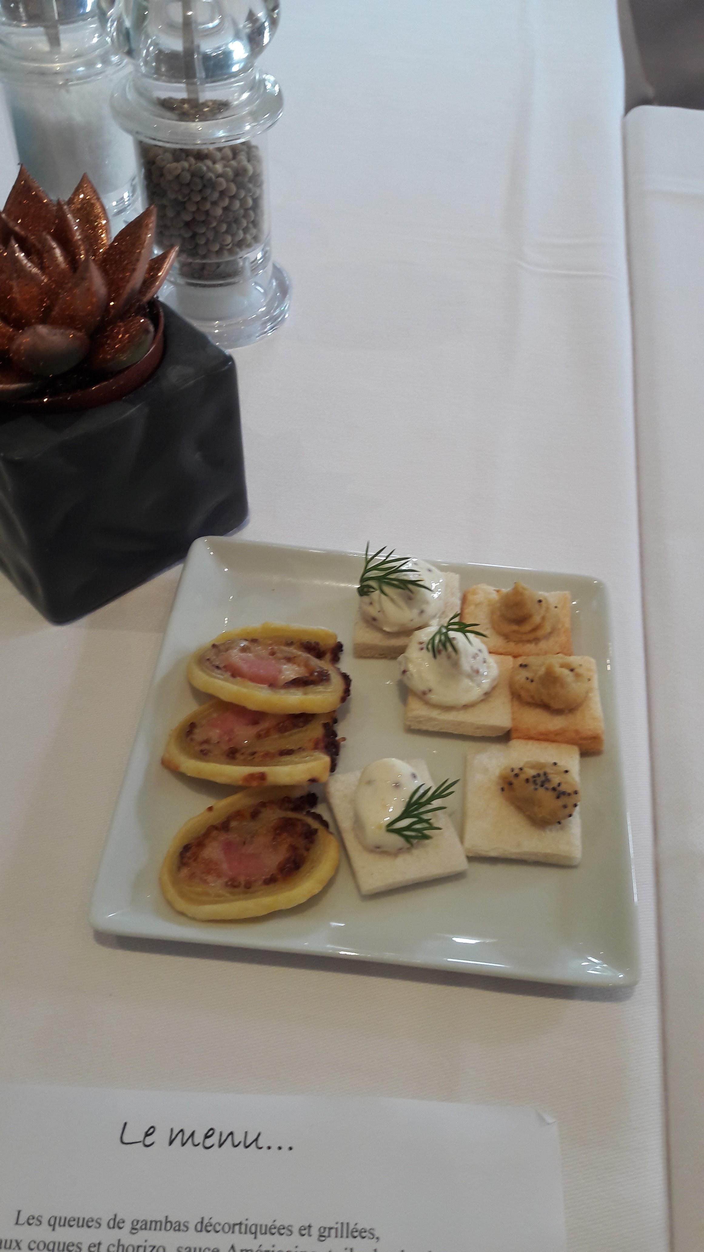 Très déçu de ce restaurant on vas commencer par le positif ! Des serveurs agréable hormis la chef de rang pas très souriante Dessert satisfaisant.... Les points négatif à mon goût ! Bien trop d'attente entre les plats vu le personnel existant dans cette entreprise ! Prix des menus bien trop chère vu les accords des produits et les goûts des produits..... ( Surtout quand on propose des plats à plus de 20 euros pour mettre des légumes râpé juste mariné avec des langoustines bien trop cuite et sûrement surgelés pour maîtriser leur coup. Poisson sans goût ! Je ne recommande pas cette adresse qui profite de son emplacement , déplacé vous plutot chez des restaurants qui savent faire de la qualité merci a vous pour cette soirée