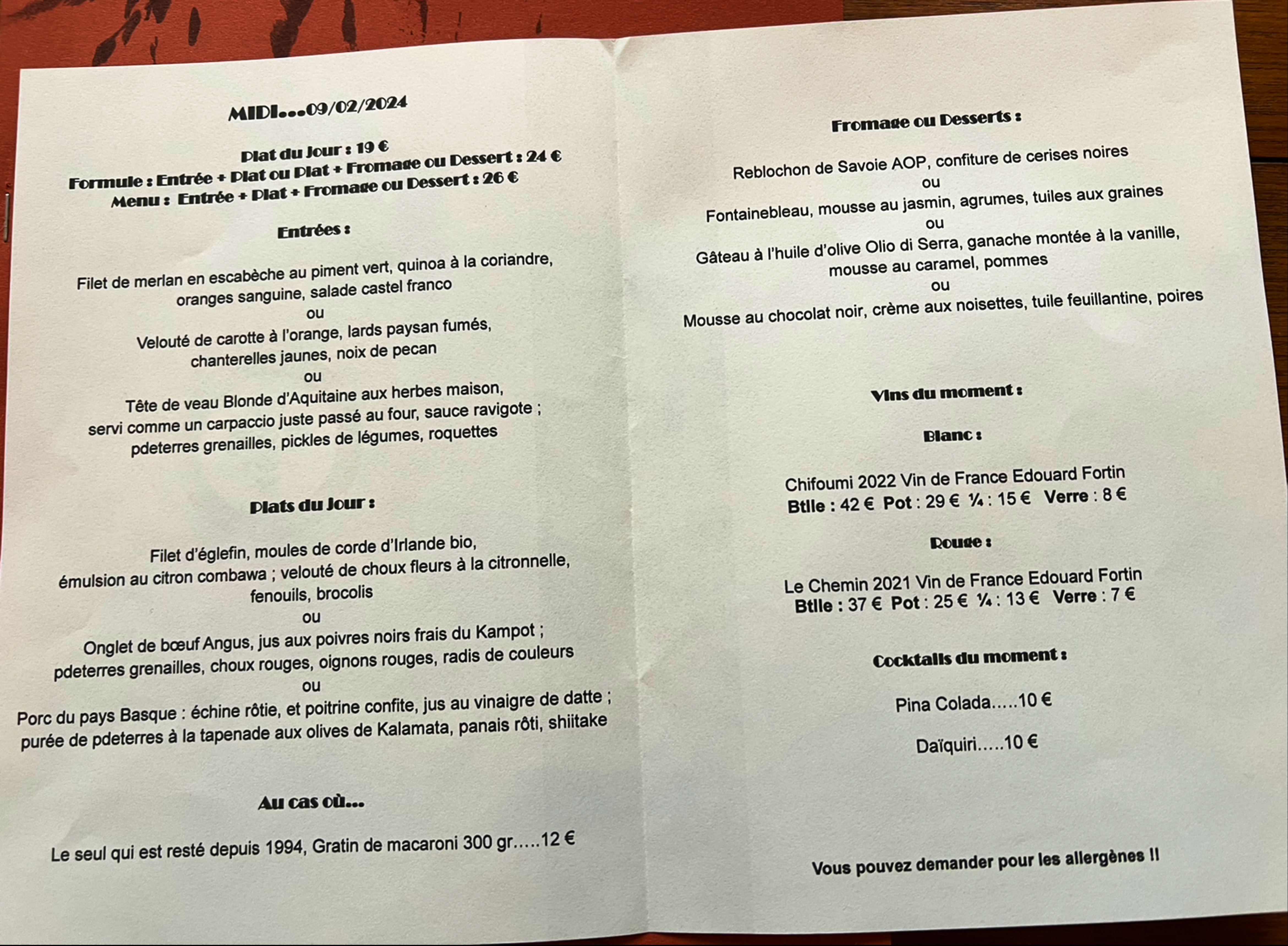 Soirée sans fausse note avec ma compagne dans ce restaurant qui cumule les points positifs ! Une carte actualisée au jour le jour, des plats raffinés avec une cuisine pointue et juste à des tarifs qui le sont tout autant. Un accueil aux petits oignons par l'ensemble du personnel. Une belle rencontre que le patron, aux petits soins, dont la passion pour les vins d'artisans a fait echo avec notre soif de produits authentiques et sans sulfites ;). Je reviendrais volontiers dans ce beau lieu de gastronomie, ne serait ce que pour découvrir les nouvelles pépites de la carte des vins.