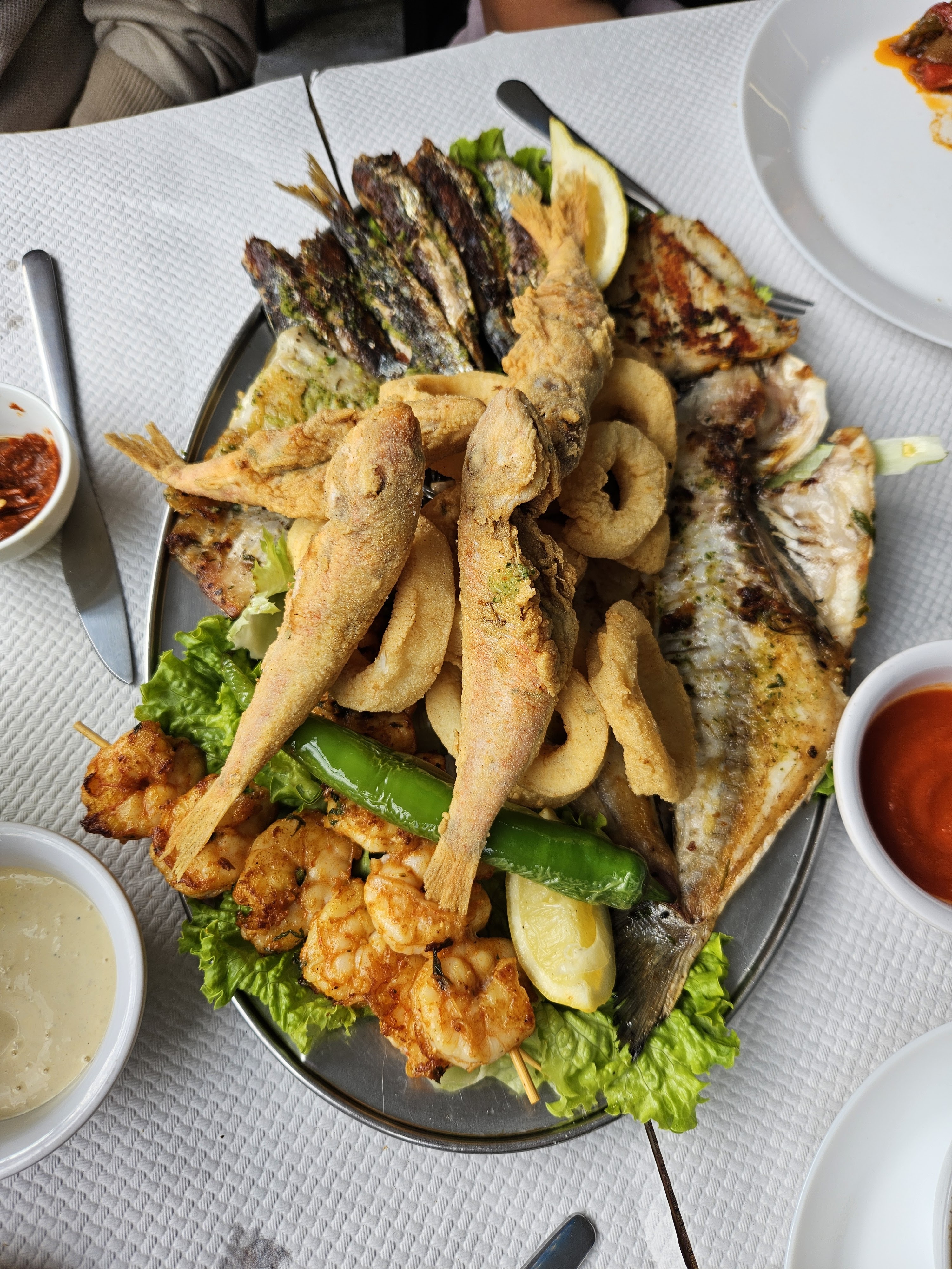 Serveuse gentille. Sauce mayonnaise de très mauvaise qualité. Sauce rouge piquante goût de poussière Crevette également goût de poussière. Tajine sardine bof . Calamar et thon ça va . Caviar aubergines incroyable bon Mais à revoir le poisson en générales très fade je ne comprend pas les 4 etoile. Je préfère taper mes 230 km à Bruxelles.