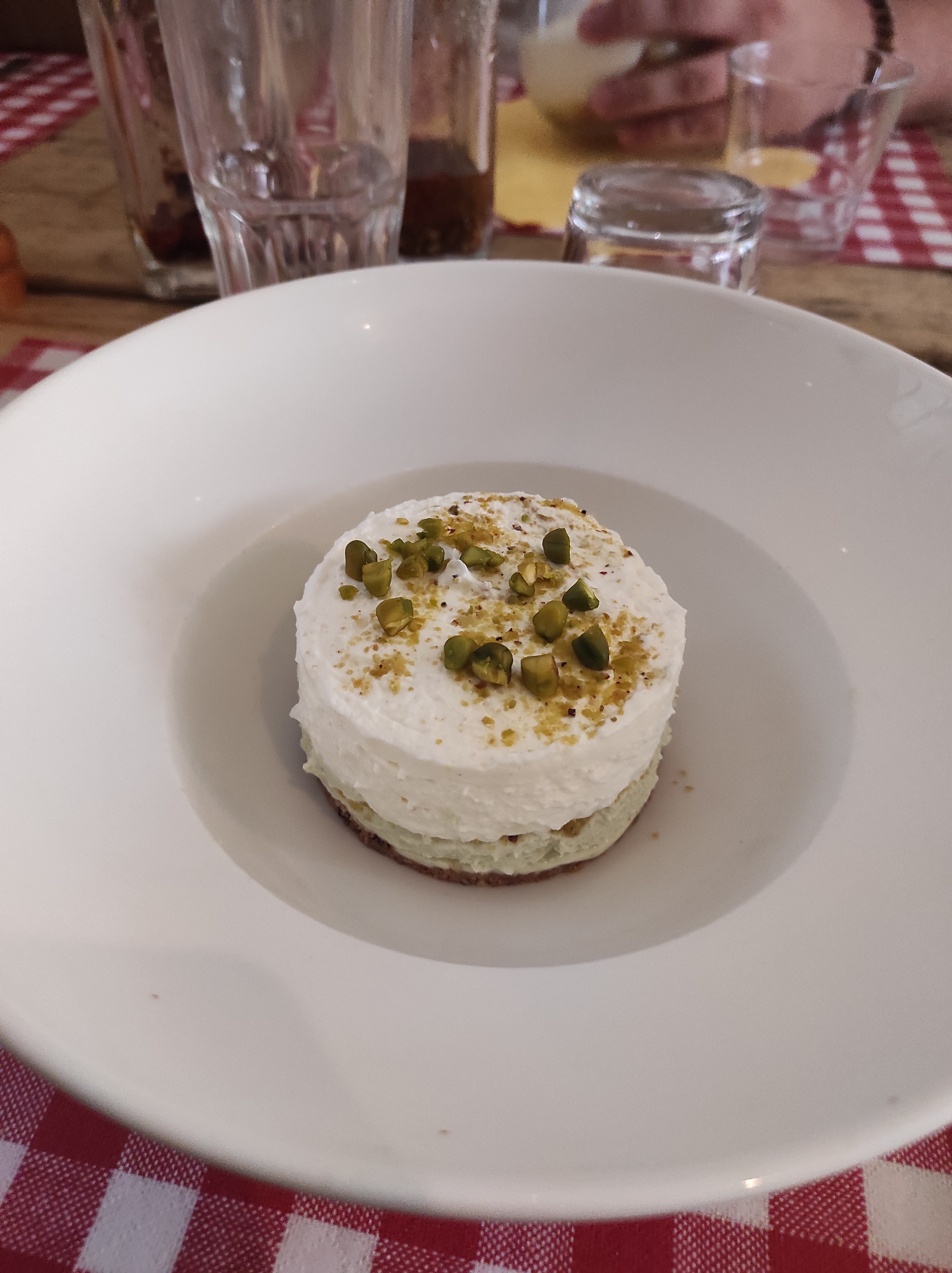 Pizza à la pistache incroyable et un tiramisu du moment ( poire/chocolat ) très bon aussi. Les prix sont vraiment abordables et l’ambiance est top 👍