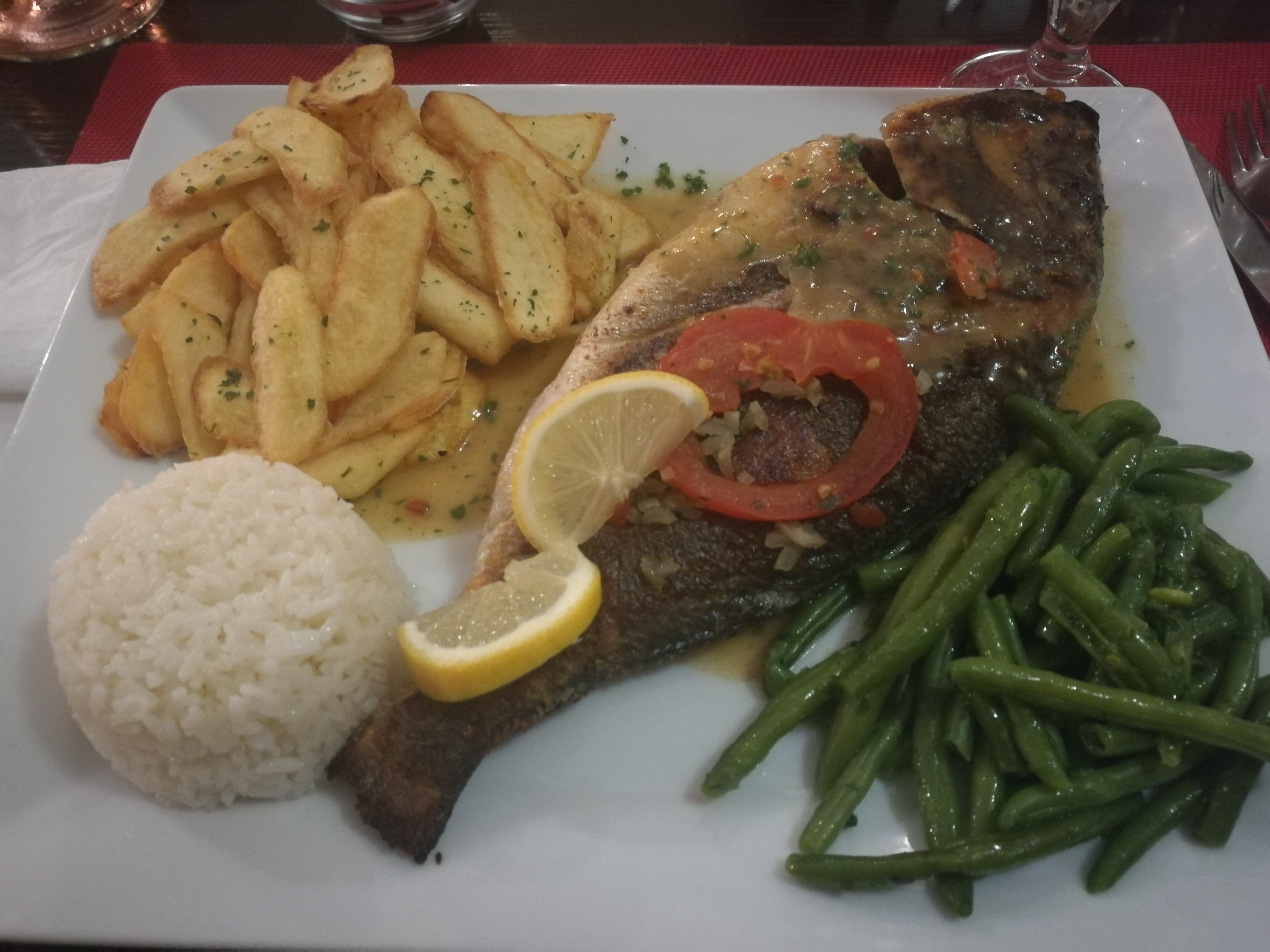 Plats copieux et très gourmands. Personnel agréable. Plat dorade avec frites et riz