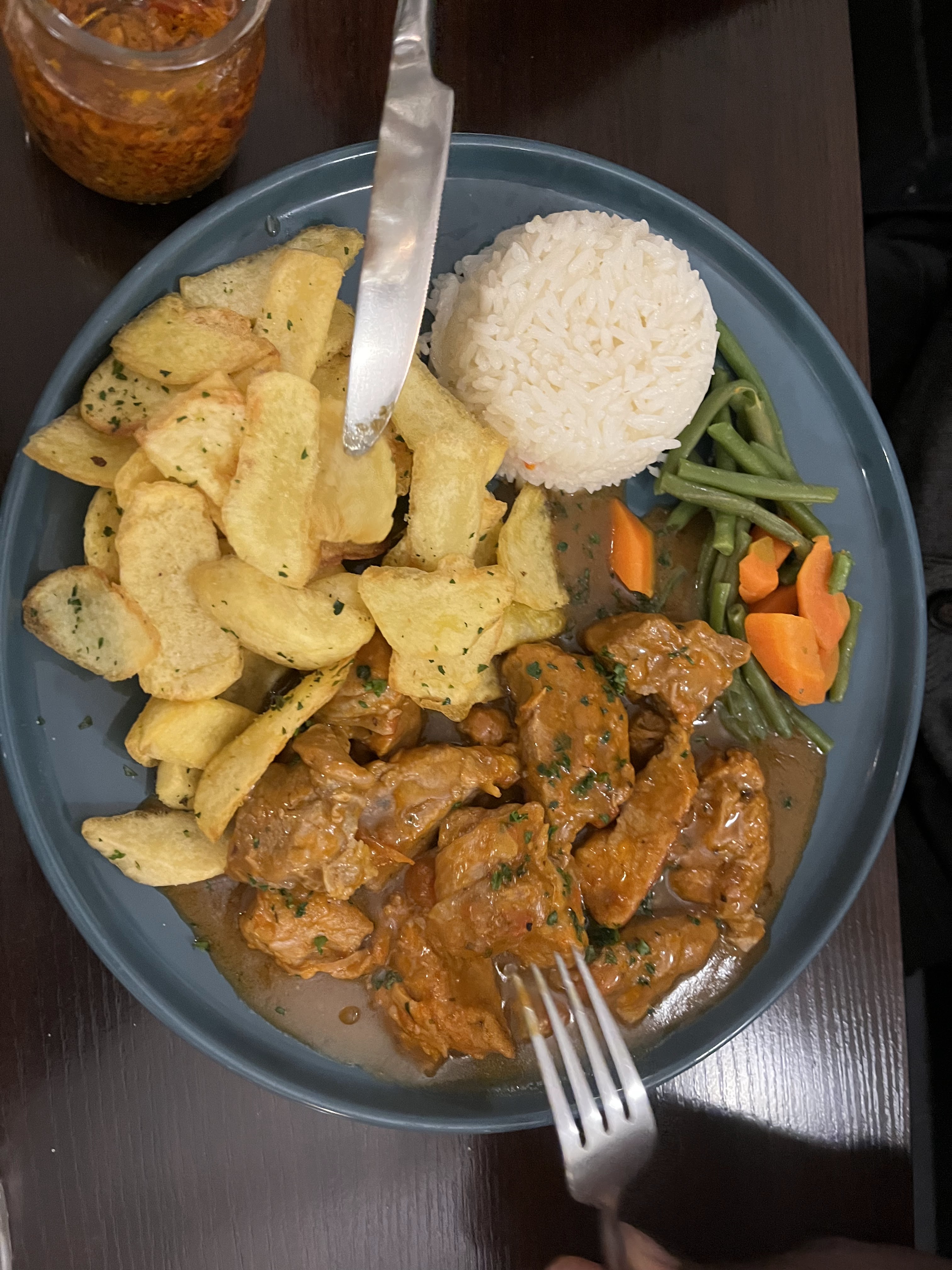 Bonjour,,,petit resto de quartier,,et connaissance avec une nouvelle cuisine.. Agréable surprise,et un bon coktail..des entrées à volonté diverses,et un plat typique. un dessert..tradi..bref .. cool et deux personnes au service, souriants , service sans soucis..✌️. Eric.H