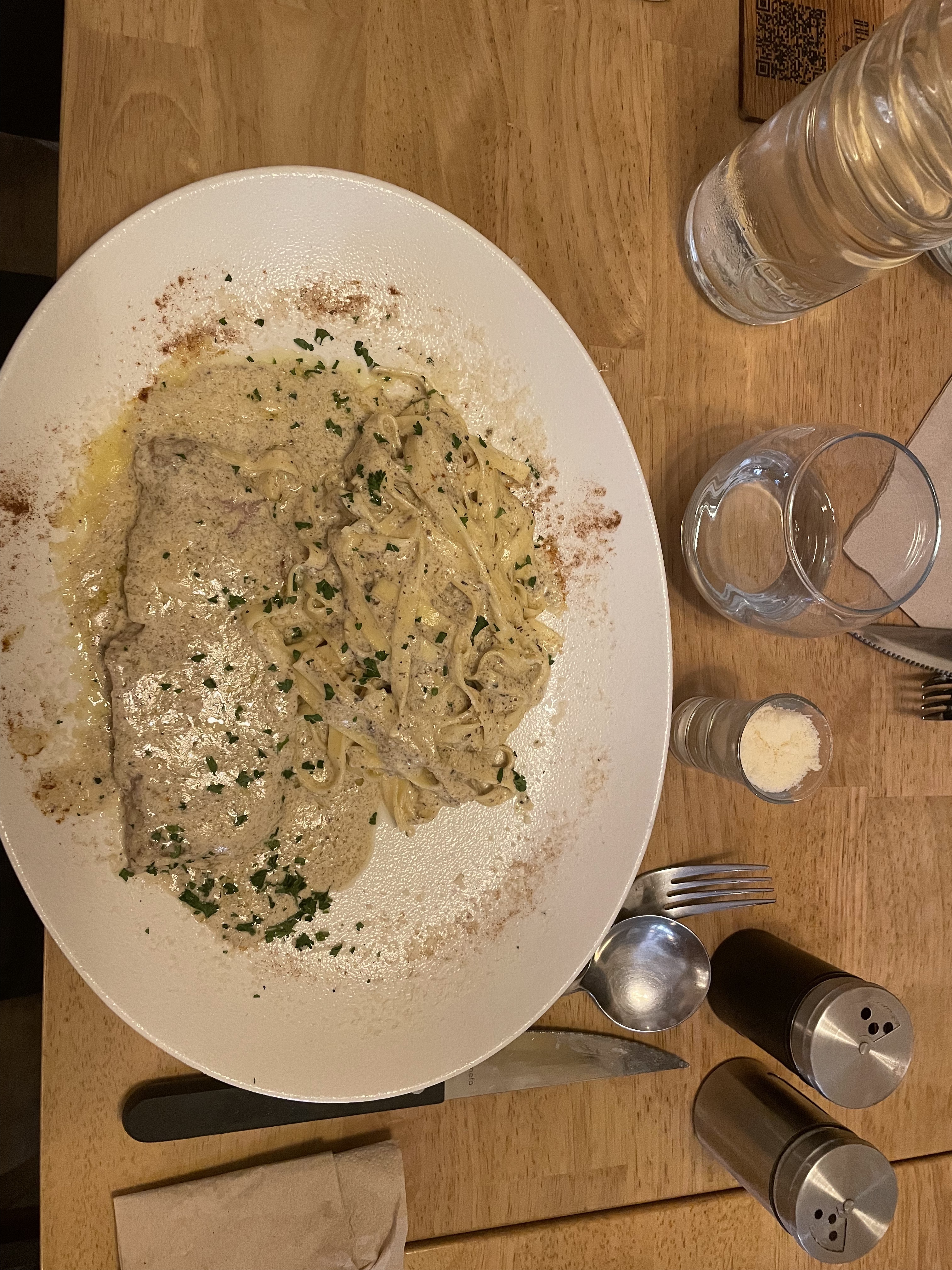 Il y a beaucoup à aimer dans ce restaurant. La nourriture était excellente, le service amical et attentionné, et il y avait une véritable ambiance énergique dans le restaurant. Notre table a commandé l'Escalope Milanaise, les Tagliatelles Burrata (que j'ai trouvées fantastiques) et l'Escalope Crème. Un petit espace mais beaucoup de cachet. Une recommandation définitive.