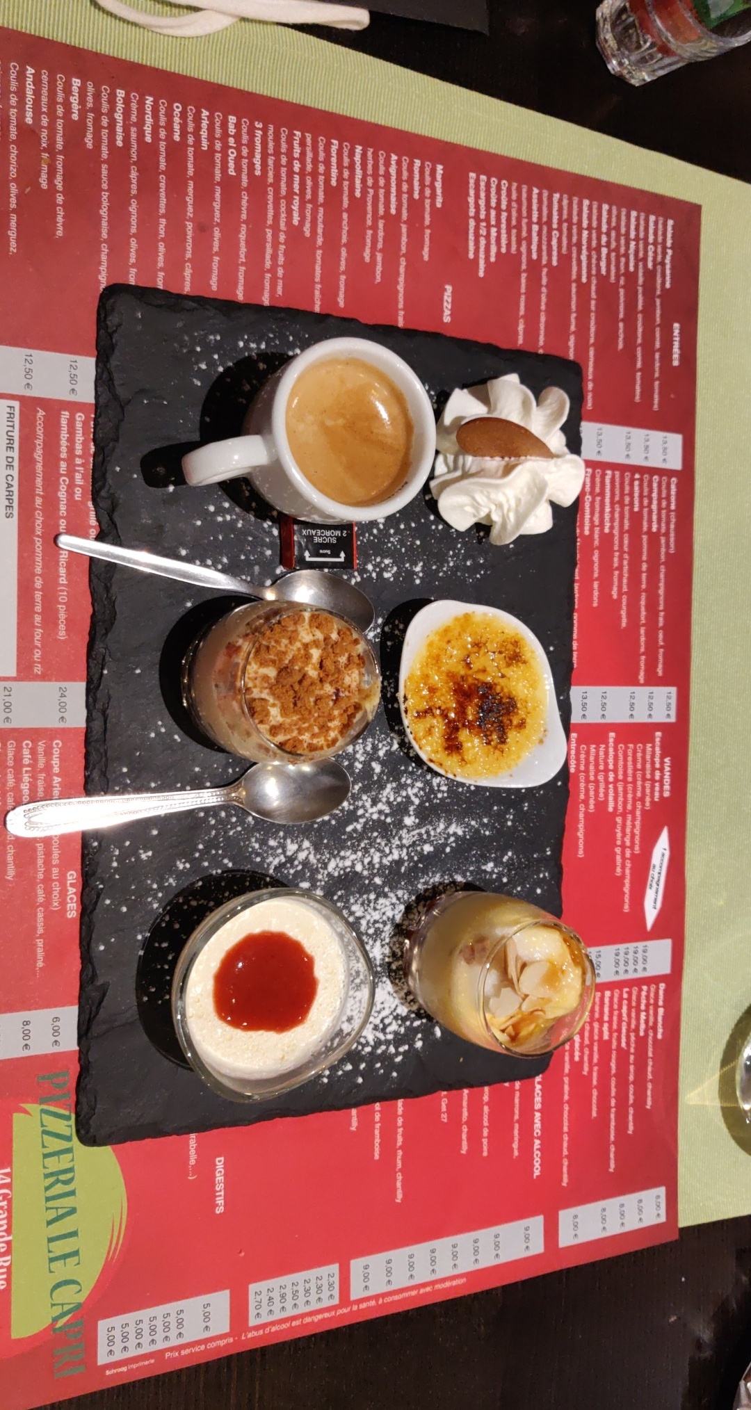 Pizza bonne, dessert également Service nikel Manque un peu de chauffage