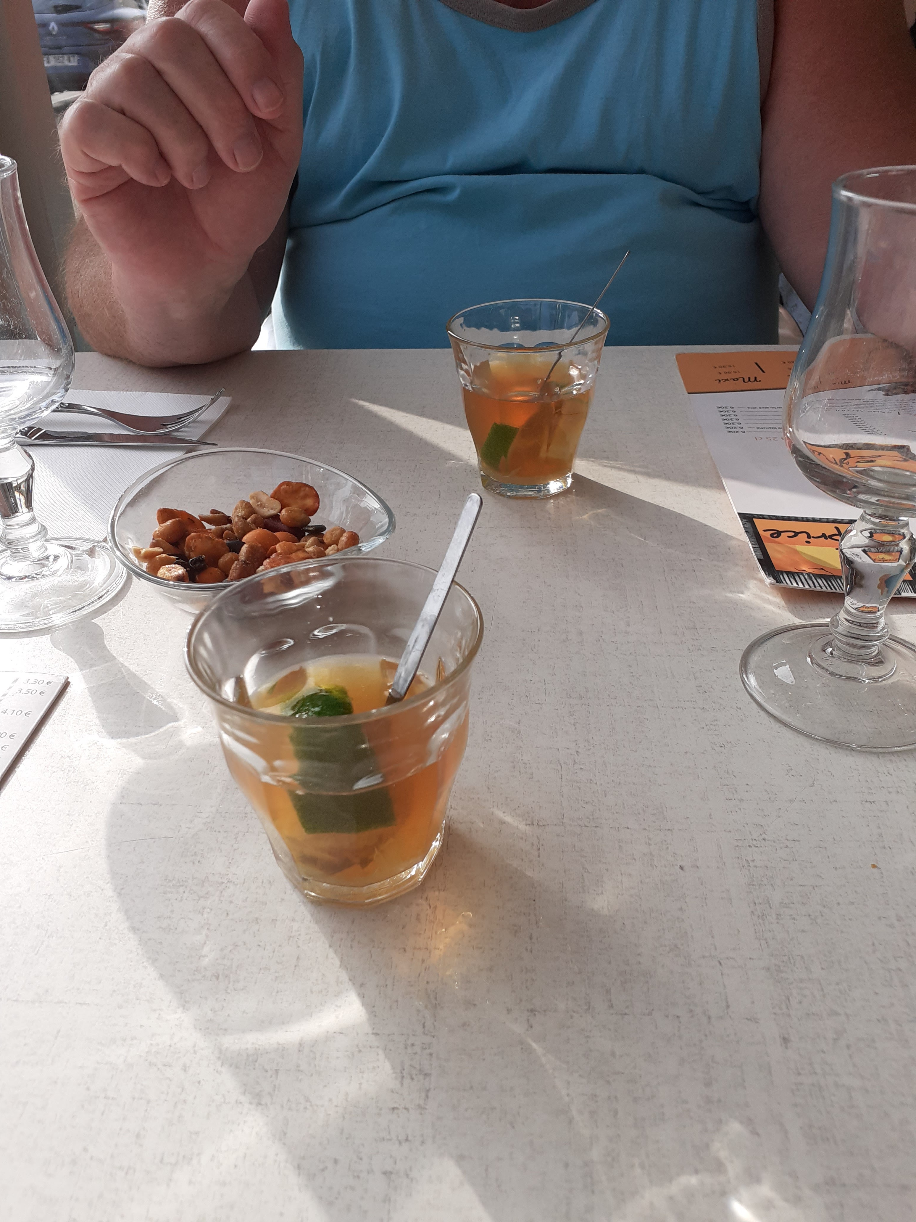 Nous sommes venus simplement pour boire un verre et manger un petit truc, brioche perdu délicieuse, les cocktails sont très bon MAIS, oui malheureusement il y a un mais…on nous balance l’addition sur la table et on nous débarrasse alors que l’un d’entre nous n’avais même pas finis. Nous avons bien compris qu’il était tant qu’on parte pour laisser notre place. Dommage, nous aurions bien pris autre chose. L’un des serveurs devrai chercher un autre emploi pour la saison, parce que franchement tirer la gueule et ne même pas dire bonjour c’est irrespectueux ! ( c’est lui qui nous a débarrassé alors que nous n’avions pas finis. )