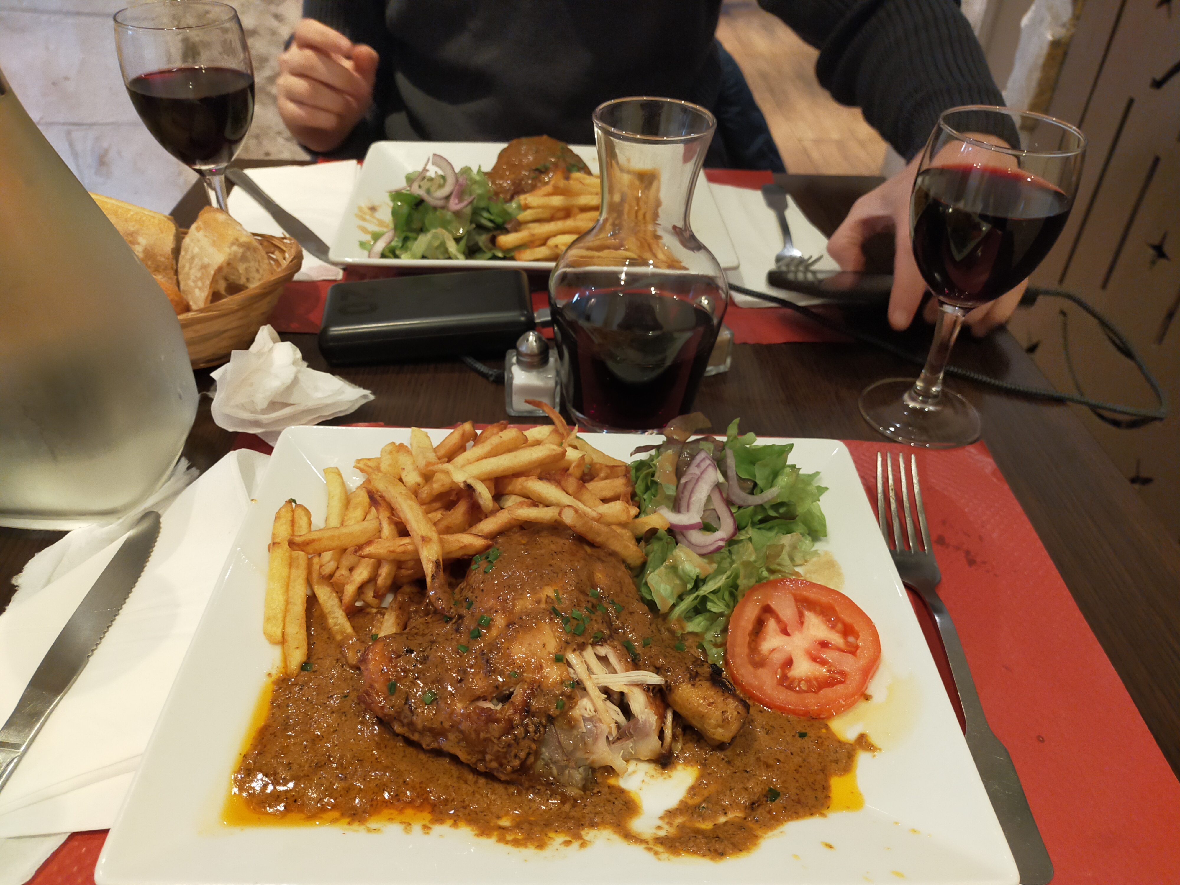 En sous effectif, service très long, fait trop chaud, cuisson de la viande non respectée (rosé au lieu de bleu) , steak haché moyen, un assez gros rectangle de plastique transparent dans la farce de la pintade, pas de couteau à viande, un bout de déchet de crevette dans un burger sans crevette, servit avec bacon alors que demandé sans bacon. Bref, beaucoup d'erreurs de service imputable à un manque d'effectif temporaire certes, mais beaucoup trop d'autres erreurs graves. Vin au verre ok, prix des bouteilles excessifs. Bonne crème brûlée et café gourmand.