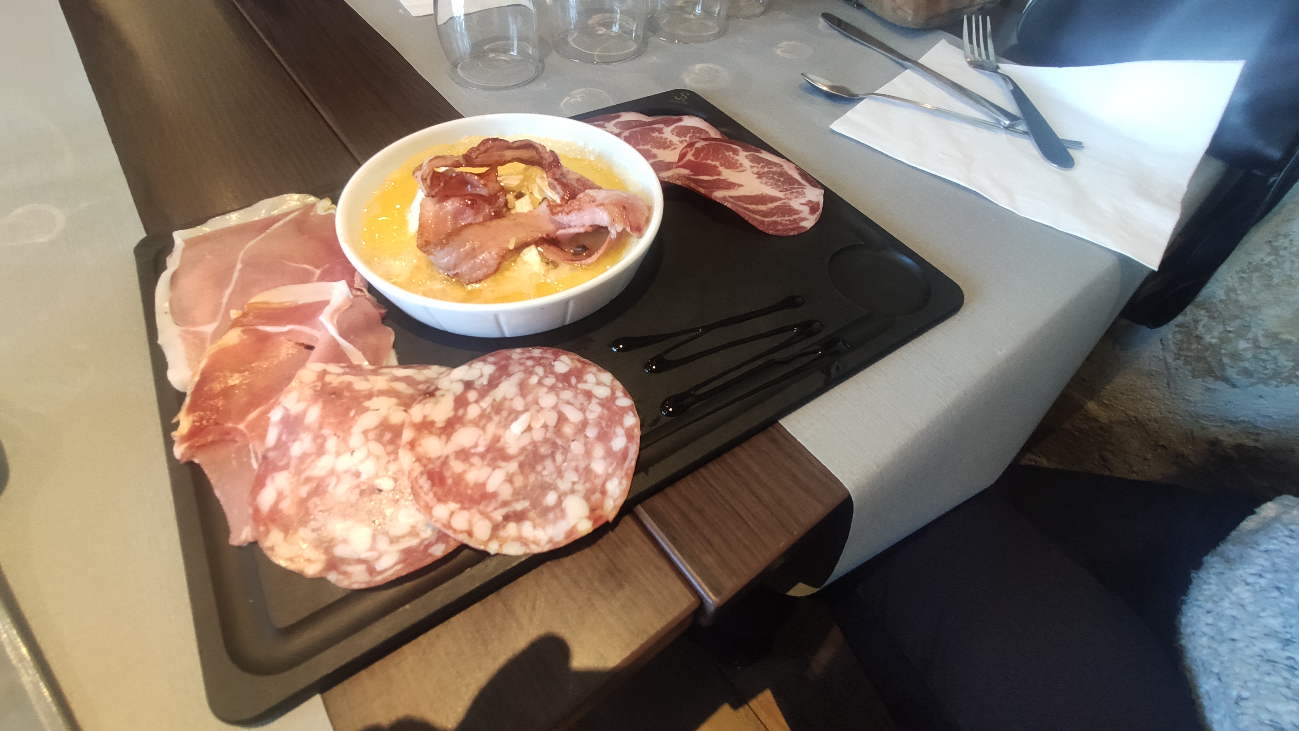 Restaurant très bon avec bon rapport qualité-prix. Nous avons pris la planche simple, puis la cocotte d'agneau et les profiteroles ainsi que la brioche tatin en dessert. La planche était bonne, en particulier le jambon. L'agneau était bien cuit et savoureux. Je n'aurai toutefois pas dit non à une deuxième tranche. Les desserts étaient également très bons. Les glaces sont des movenpick donc savoureuses. J'aurai préféré une sauce chocolat noir sur les profiteroles mais c'est un goût personnel. J'ai pris un verre de blanc et un ver de rouge, les deux étaient très bons. Les plats étaient copieux et le service impeccable et rapide.
