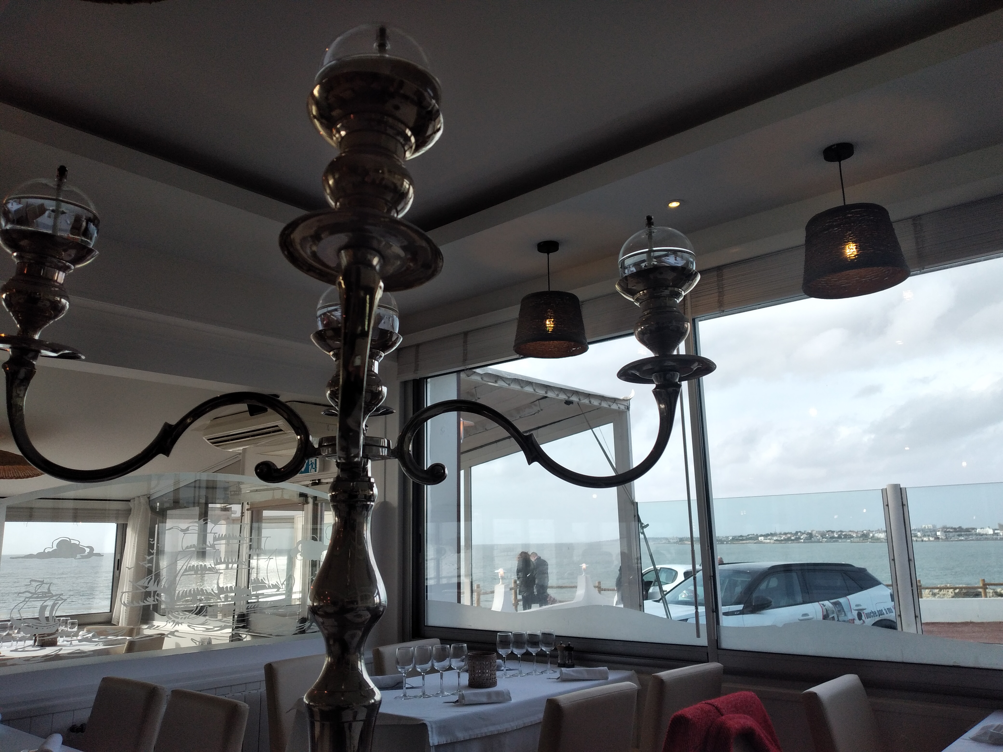 Belle vue sur la mer et sur Royan. 2 coupes de champagne ( avec brezel et chips 1er prix).comme au bar du port . 2 menus gourmands (saumon mariné sans plus et petite assiette fruits de mer crevettes encore givrée à cœur), queue de lotte façon ouate trop bouillie! sans saveur qui baigne dans un jus insipide avec des petits poivrons coupés en 2 aucune présentation. Mon bar était bon. Le tout pour 165€. Bon anniversaire ma femme 😉!!.