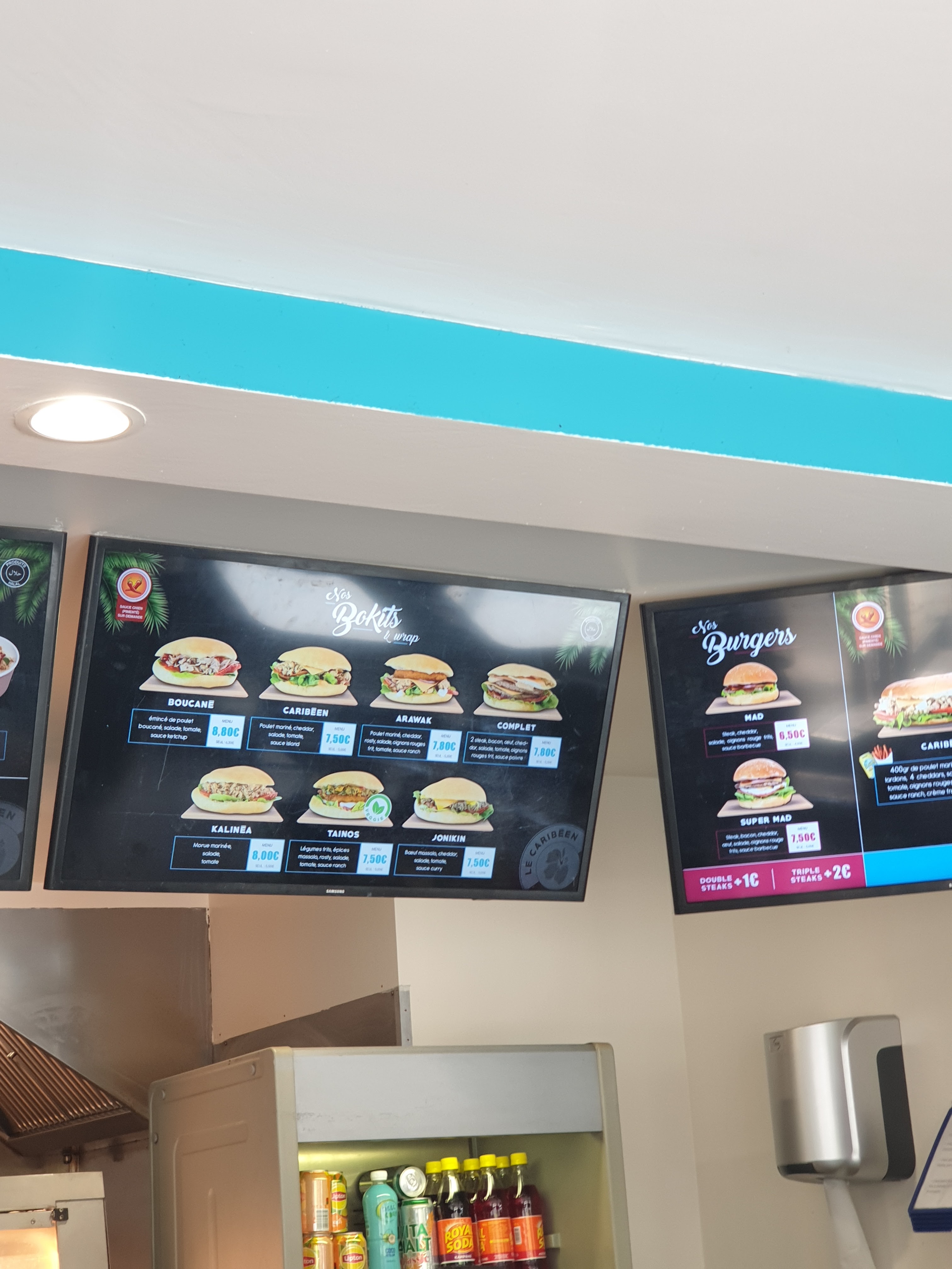Fast-food caribbean, les écrans pour commander les menus sont top et bien expliqués, sur chaque menu il y a la description des aliments. Il y a des bokit des agoulou… j’ai bien aimé je recommande