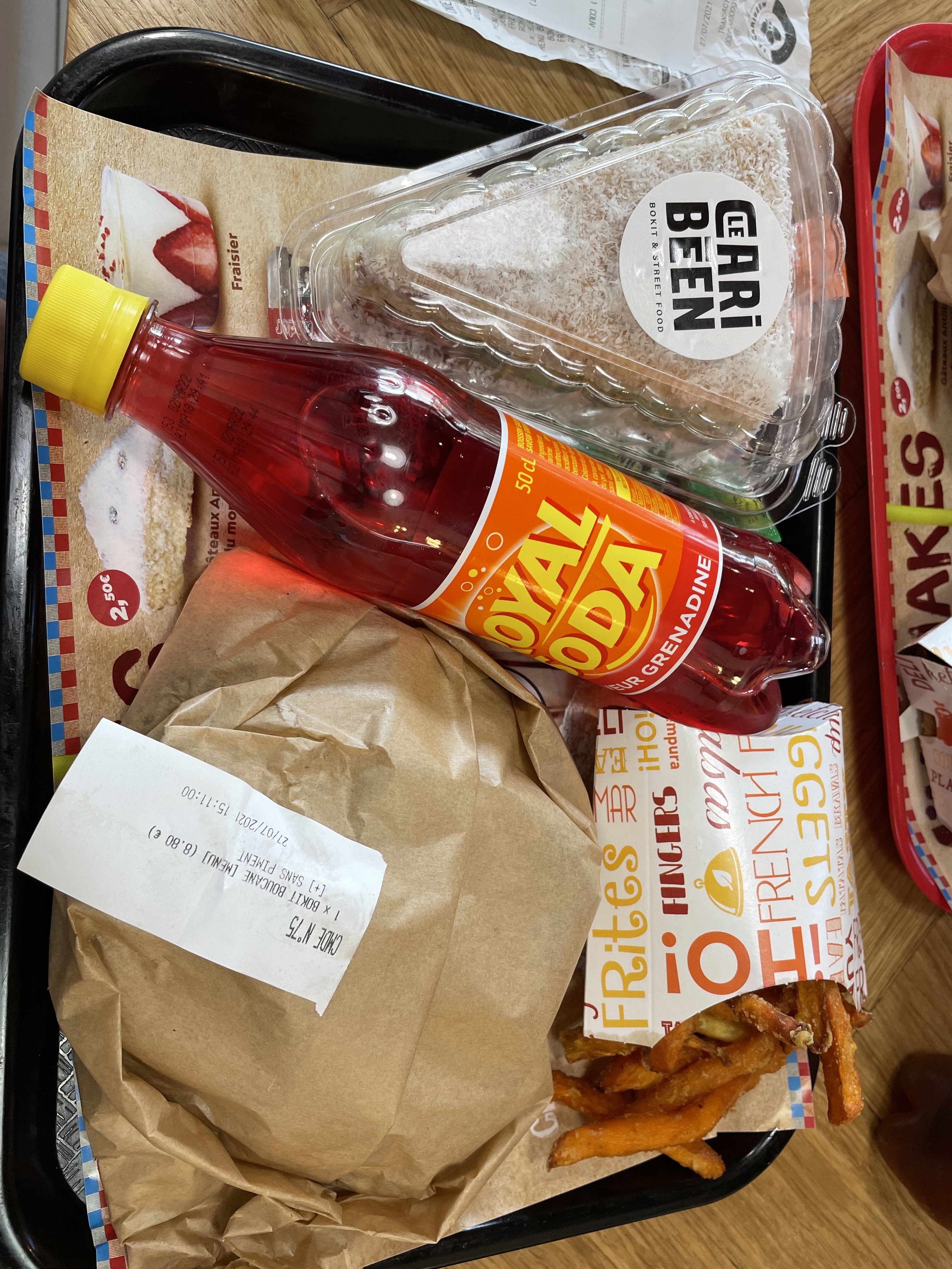 Le bokit poulet boucané est bon et bien garni, sauf l’arrière goût cramé et la pâte à bokit était sec…!!!! Pas fan des frites de patates douces molles, et la part de gâteau mont blanc on se demande où est la crème ?? C’est limite…!!! Rien de ouf mais bon à refaire pour tester…
