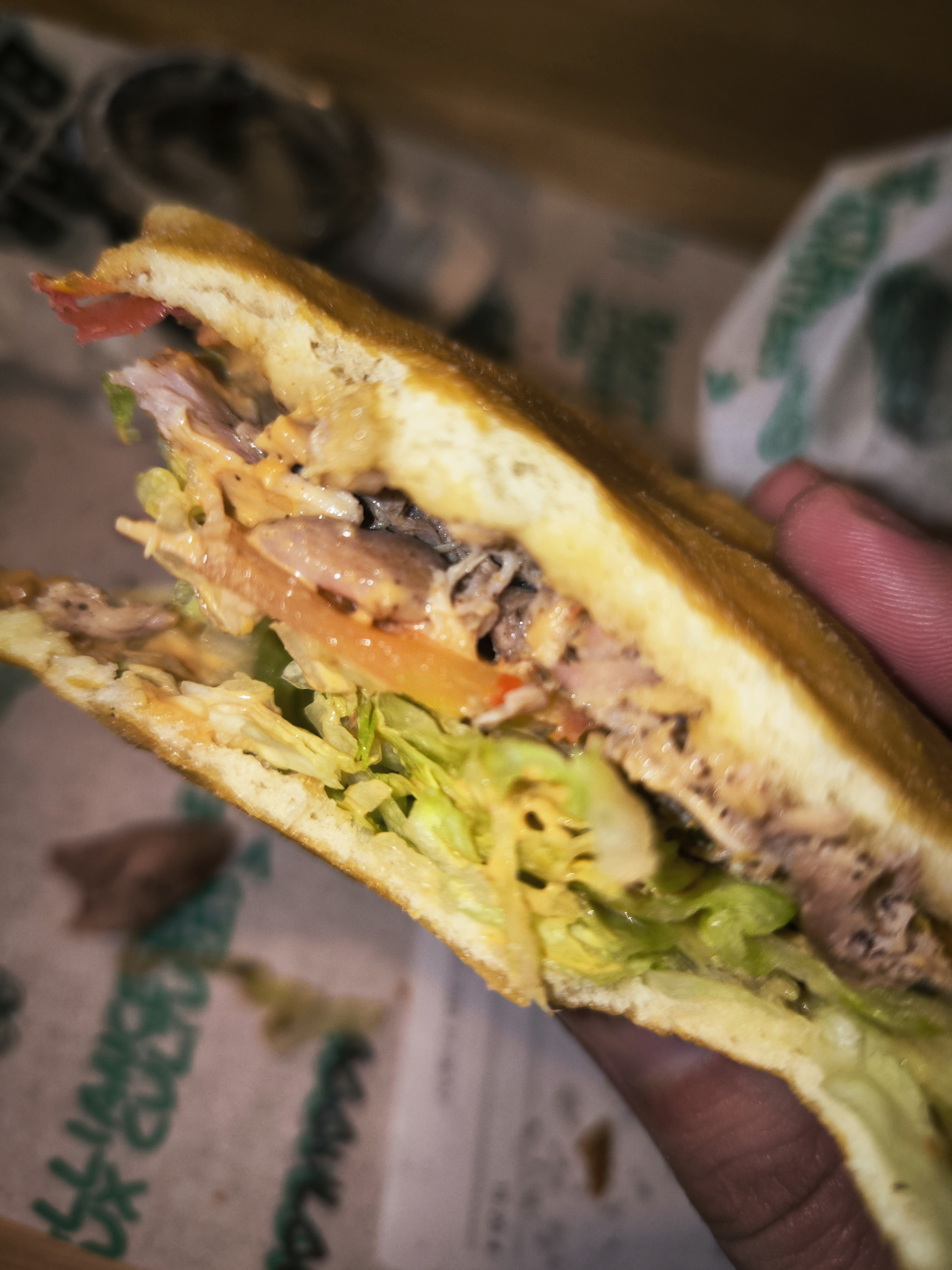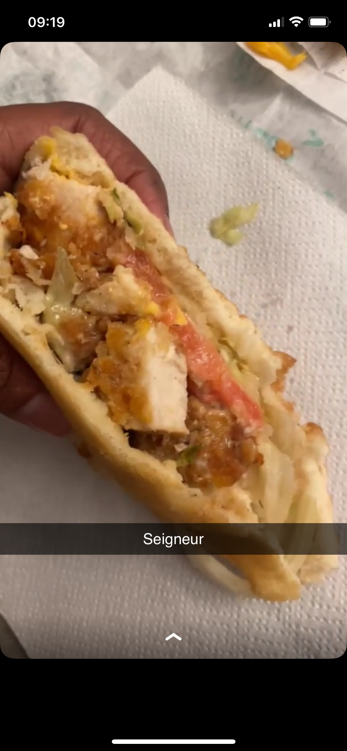 Pas bon du tout Le pain s’effrite , trop de sauce , morceau de poulet sec bref pas à mon goût.