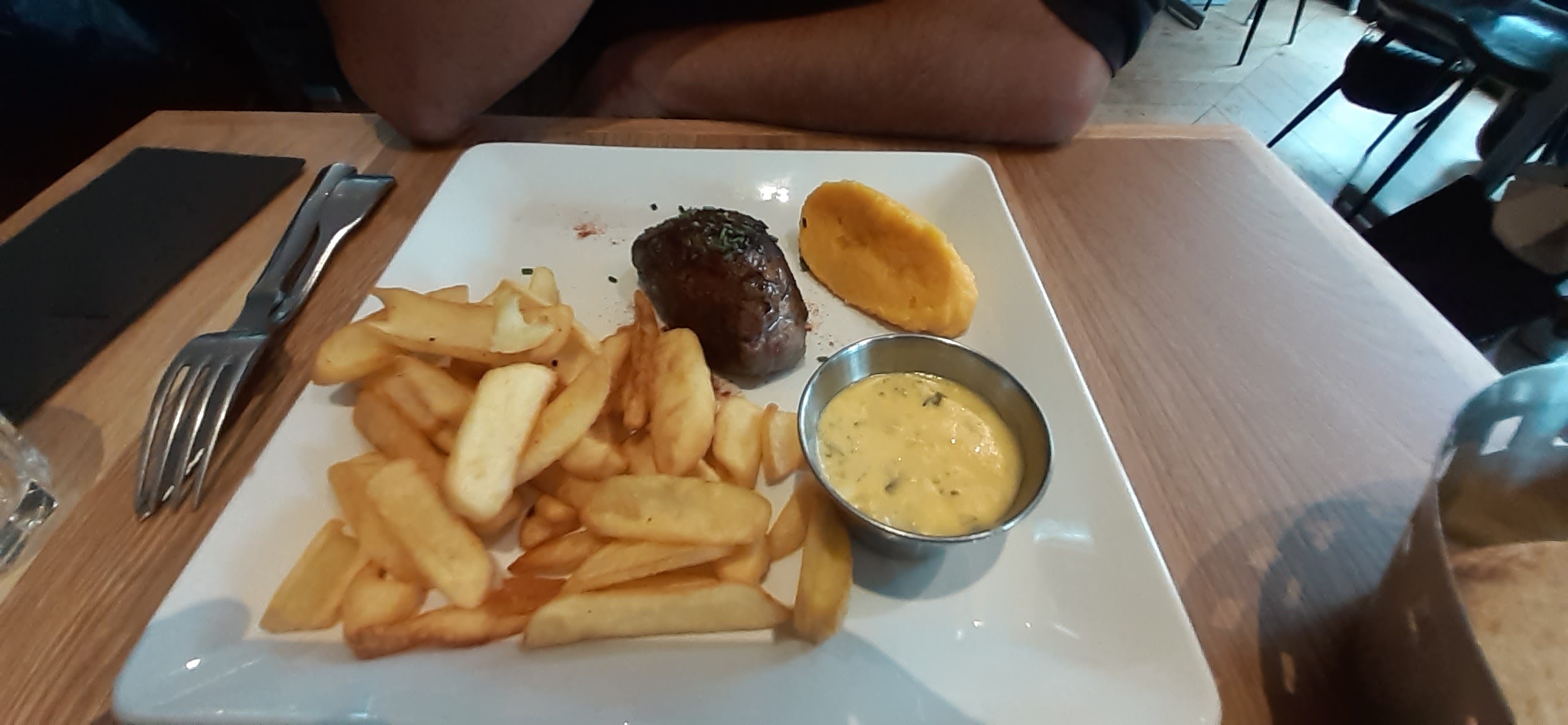 Endroit très bruyant où vous ne pouvez pas choisir votre place. J'ai commandé un pavé de bœuf/frites. En voyant l'assiette, j'ai pensé à un menu enfant ! Mais non, l'addition me l'a confirmée ! Je n'ai jamais vu un pavé aussi petit et si peu de frites dans une assiette. Très déçue 😏