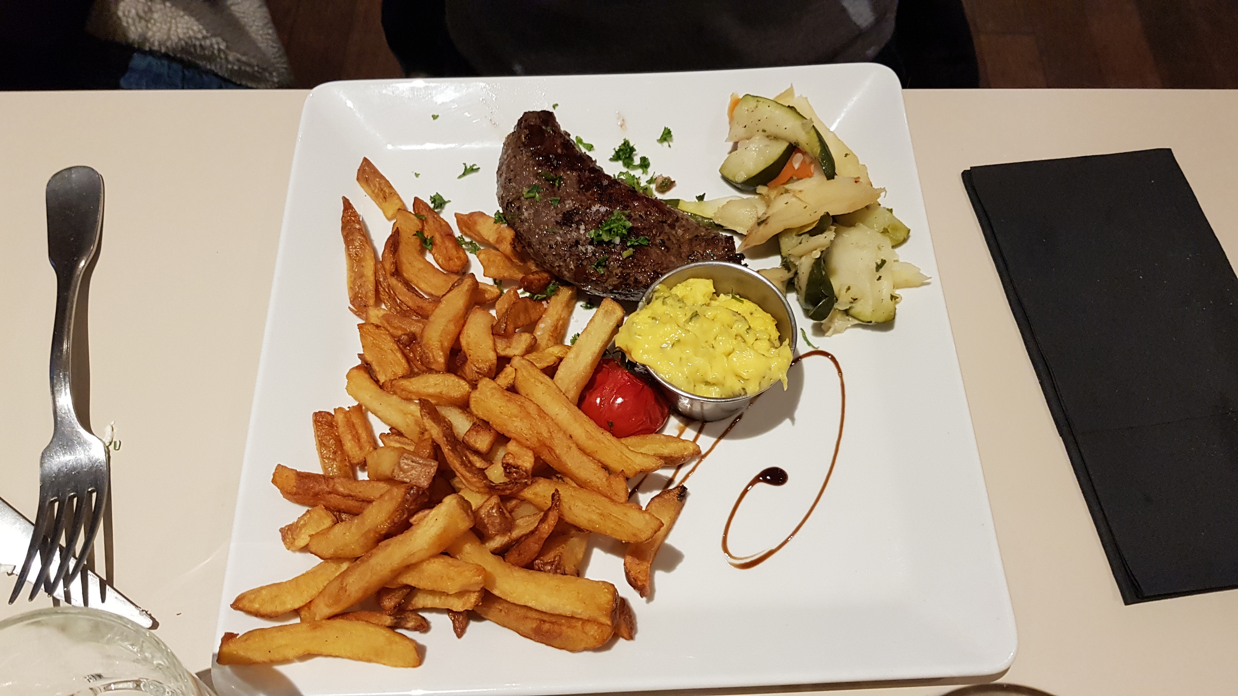 Nous avons commandé un pavé de bœuf bleu, la cuisson était parfaite et les sauces excellentes. Je recommande cet endroit, le patron et la patronne sont très aimables