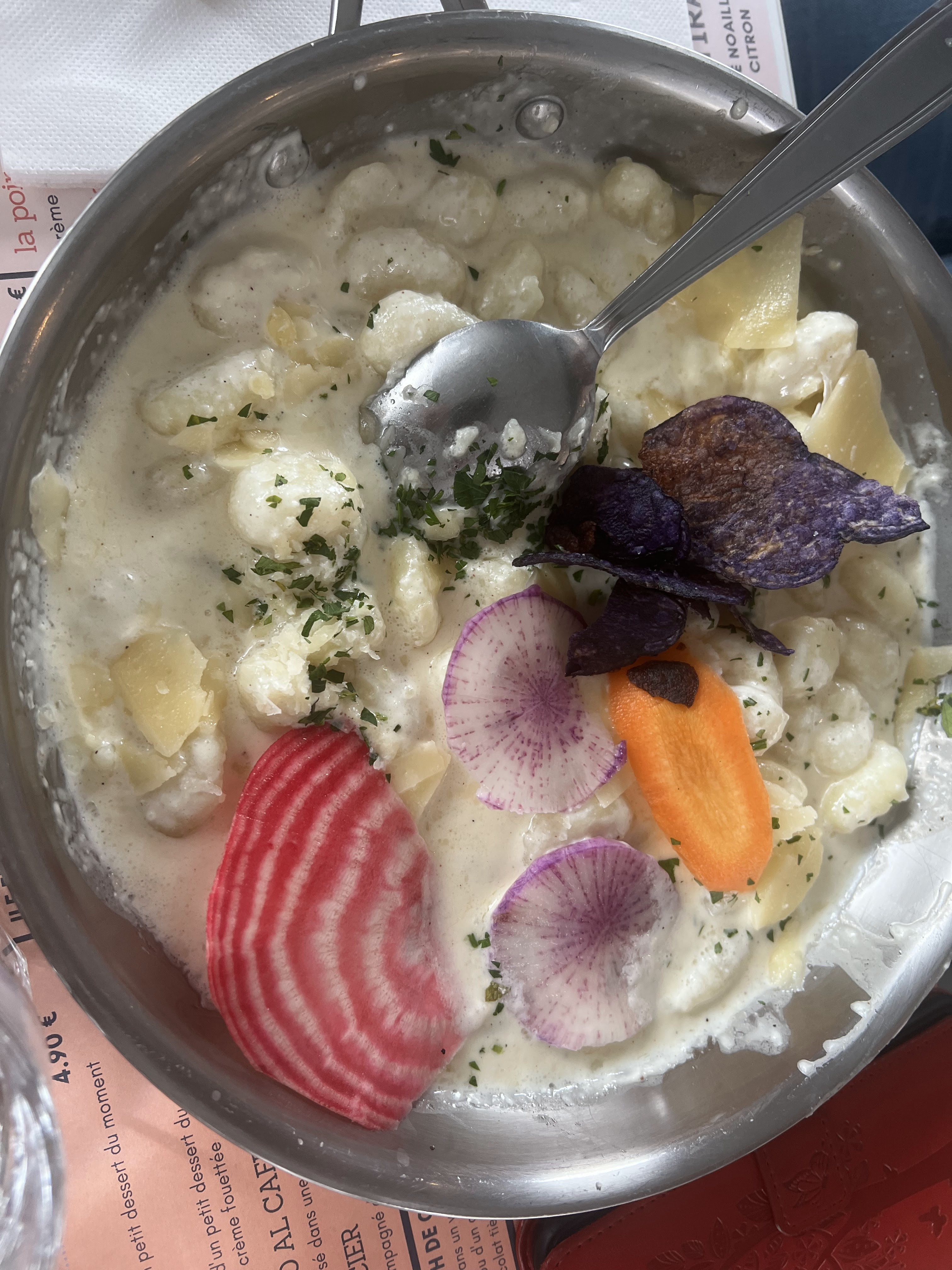 Nous avons mangé avec mon conjoint. Nous sommes reçu par un monsieur qui nous dit de nous installer à l’étage. Arrives à l’étage, nous nous installons à une table (car il n’y avait pas de serveur). Une dame vient nous voir et d’un air hautaine nous demande de partir de la table car elle n’est pas dressé, et qu’elle ne le fera pas. Qu’on a qu’à s’installer à une déjà dressé (j’avoue qu’on avait pas vraiment prêté attention à quelle table était faite ou non….) On s’installe sagement à la table enfin indiqué, puis nous commandons des gnocchis du chef (tomate cerise, oignon, basilic,…). Les poêles arrivent et… ce n’était pas ce qu’on avait demandé, juste des gnocchis sauce tomate simple, encore froid… on demande à la serveuse de nous renvoyer ce qu’on avait commandé initialement. 5 min plus tard on a les mêmes poêles avec les rajouts fait mais toujours aussi froide. On essaie de manger quelques gnocchis mais c’est vraiment pas bon. Les gnocchis sont froid, pâteux, et malgré le rajout, on arrive pas à avoir de goût… Nous n’avons pas pris de dessert, ça nous a dégoûté… Bien dommage.
