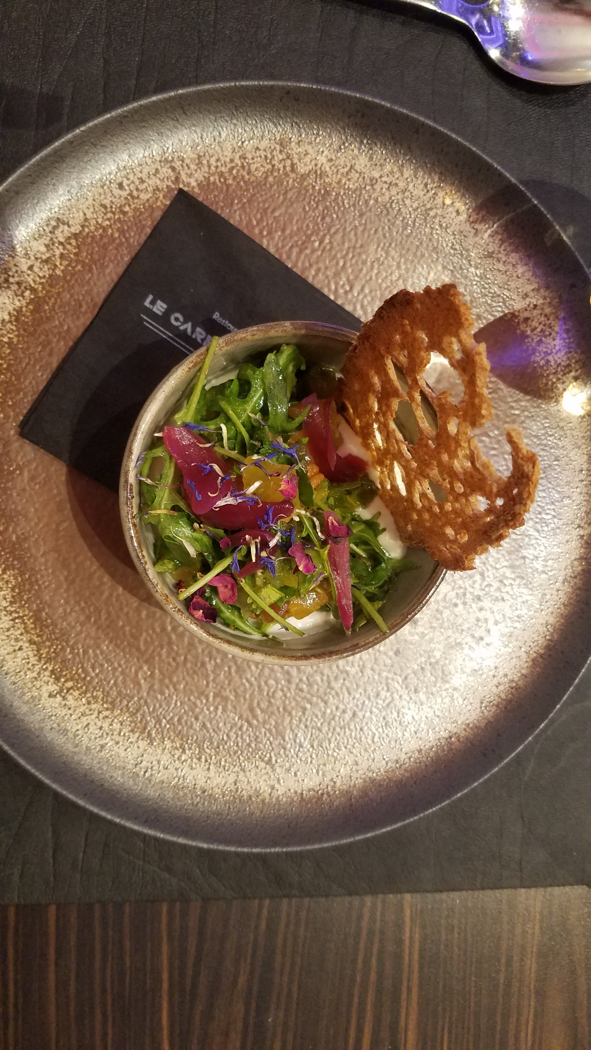Par son décor, lieu haut en couleurs et en saveurs par sa cuisine raffinée et sa sélection de vins, par son personnel attentif et sympathique, nous recommandons ce restaurant . Particulièrement les entrées mais aussi les desserts, comme l'inoubliable tarte déstructurée, aux abricots ont ravi nos papilles. Nous avions déjà fréquenté le Carré d'As ces dernières années le midi, le dîner nous a paru encore meilleur !