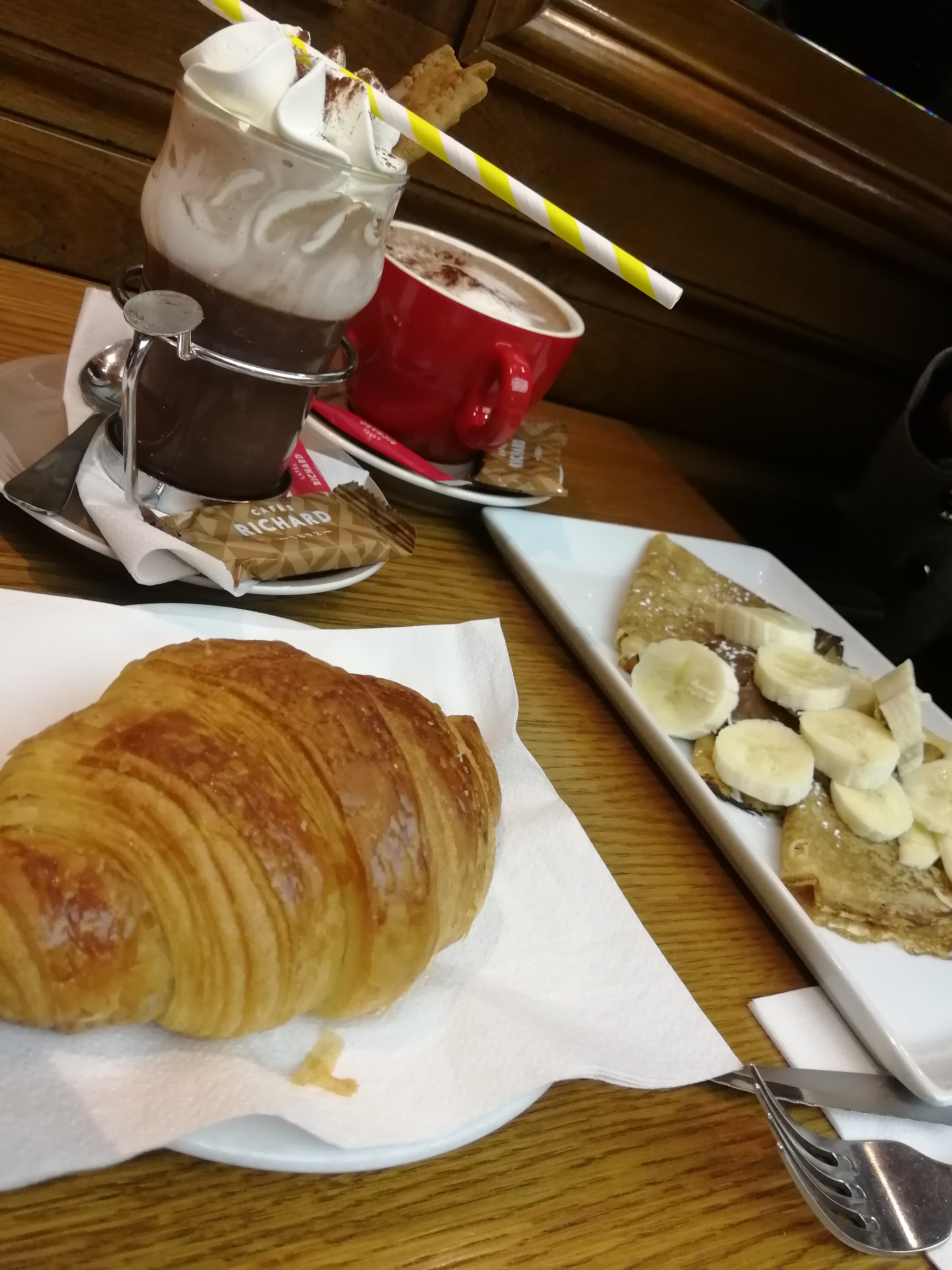 Bon emplacement, bon atmosphère (décoration, musique, lumières, température). Naturellement, prix élevés, mais sans surprise pour un café parisien au centre/à ce quartier (6,50€ le cappucino. 7€ le chocolat chaud). Mais il faut dire que les boissons étaient très bonnes..