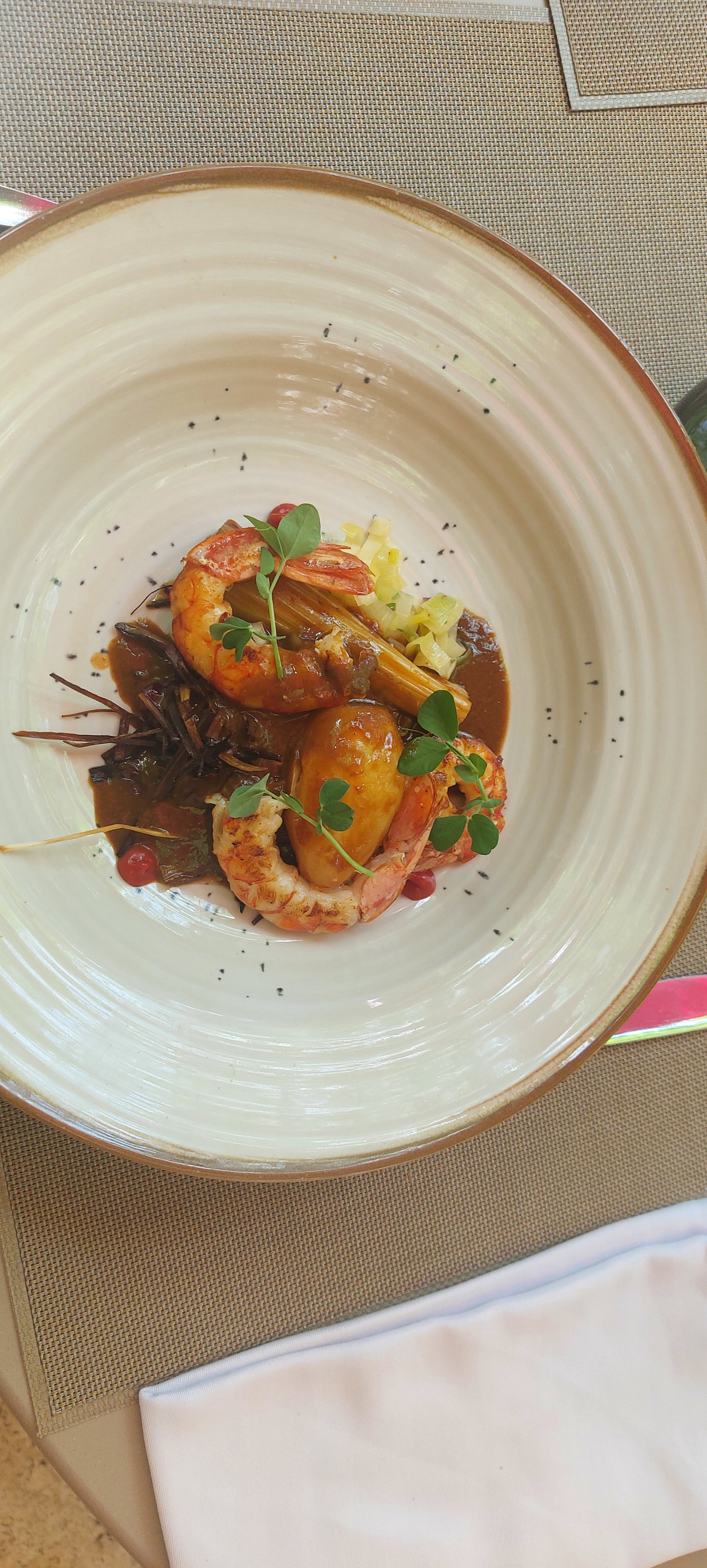 Le cadre est très agréable. Idem pour l’ accueil, professionnel. Le plat à base de gambas et saint Jacques est juste exceptionnel 😋👍👍