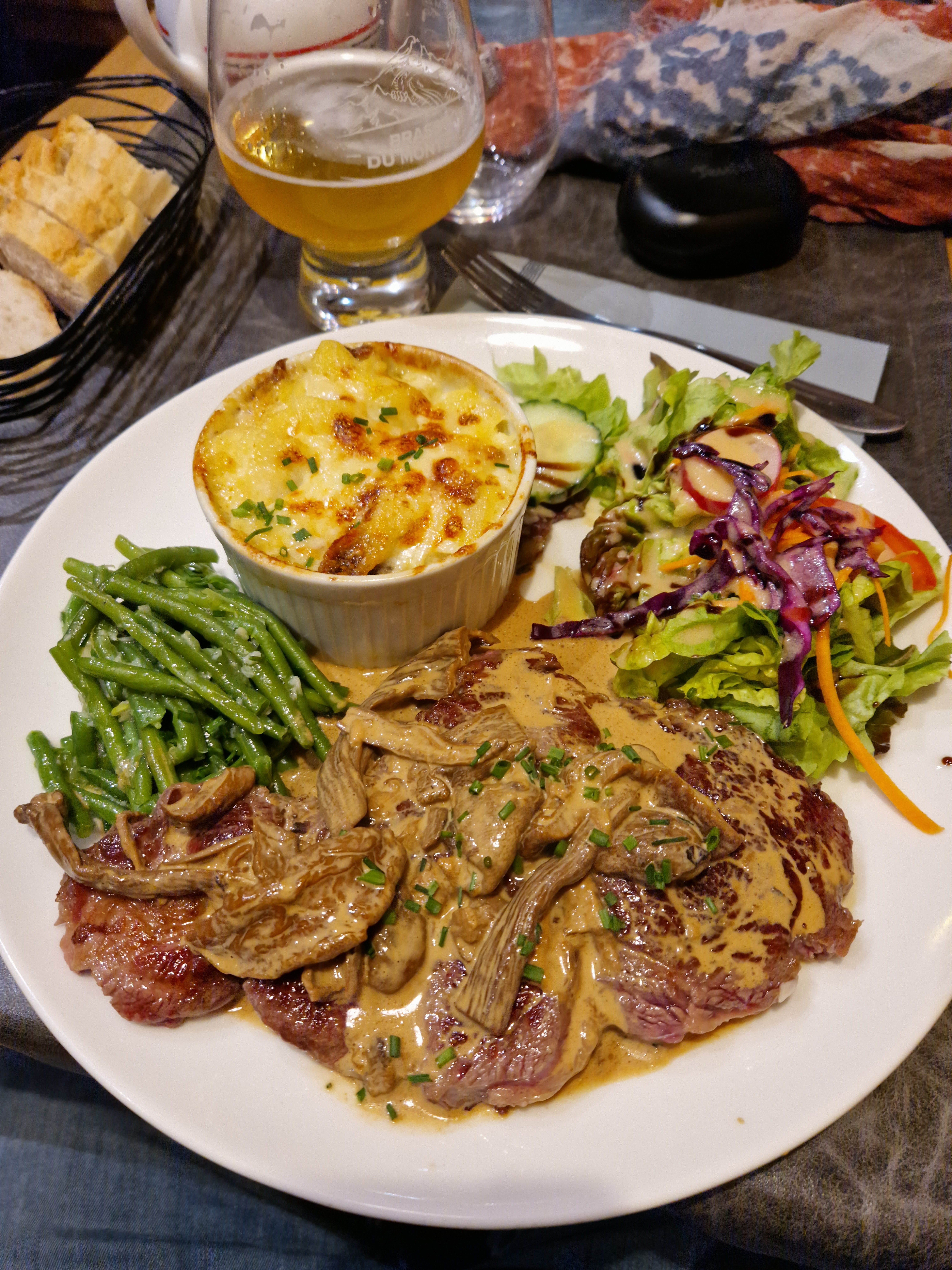 Cadre agréable, serveuse souriante et professionnelle, tarifs raisonnables. Hélas, mon entrecôte était peu épaisse, trop pleine de gras et dissimulée sous la sauce dite aux cèpes. En effet, je n’y ai pas trouvé les champignons attendus et la sauce ne semblait pas mijotée maison.