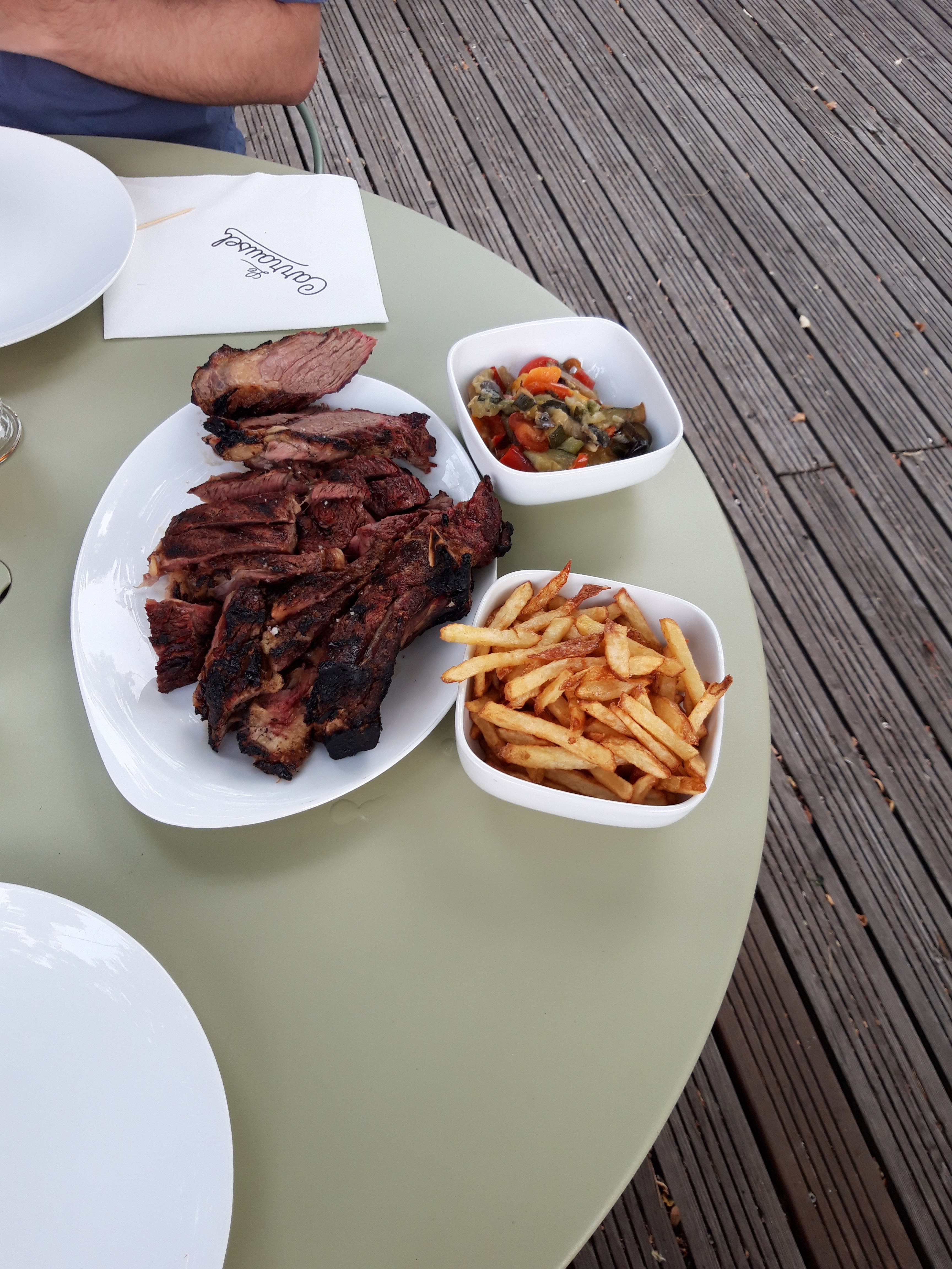 Resto qui était avant le MAS ROUGE.salle spacieuse, avec de vrais arbustes grandes et petites tables. Personnel souriant,aimable,et rapide.Pour le repas en entrée un croque-monsieur avec un oeuf dessus, très bon.les plats nous avons pris des côtes de boeuf,de la sole,et du cabillaud. Excellent.Les frites pas bonnes,pas chaudes et trop colorées, pourtant ce sont des pommes de terre fraîches, dommage. Pour les desserts très bon.Juste ce petit bémol, autrement tout est bon.