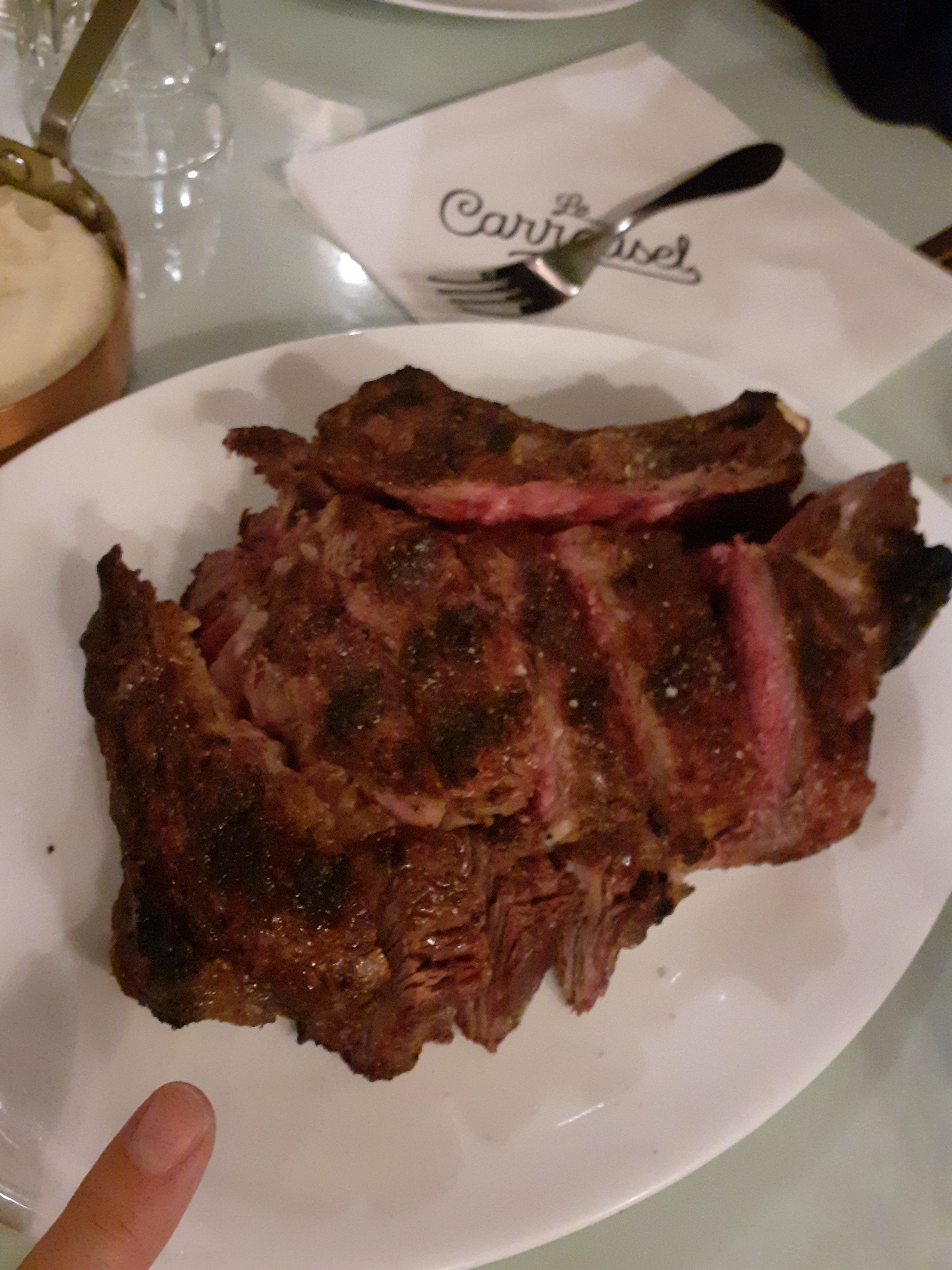 Nous avons pris des entrecôtes de l’Aubrac ; 27€ quand même Et bien , pour une demande de cuisson bleu , pas une seule goutte de sang à l'intérieur ? à l'extérieur pas assez cuite te finalement froide à l'intérieur. On s'est pas régalé avec ces entrecôtes. On ne reviendra pas