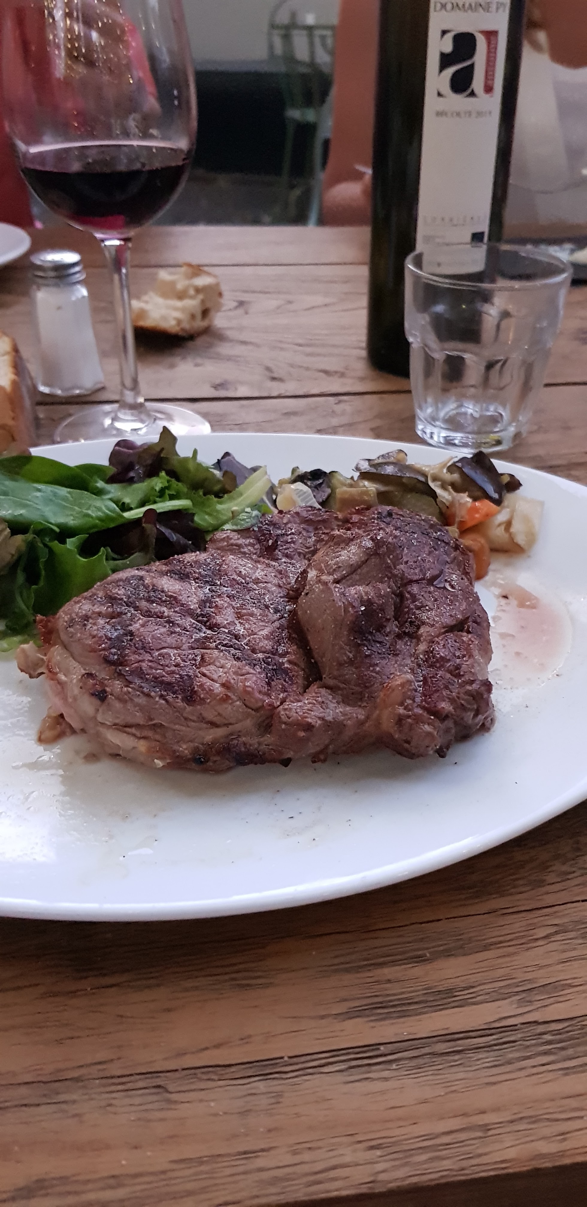 Belle espace terrasse, la carte est bien équilibrée - beignets de fleur de courgette en entrée, sympa - entrecôte en suivant, saignante demandée mais légèrement trop cuite, dommage - les frites étaient également mal cuites - le vin du domaine de py était agréable - les tarifs sont corrects