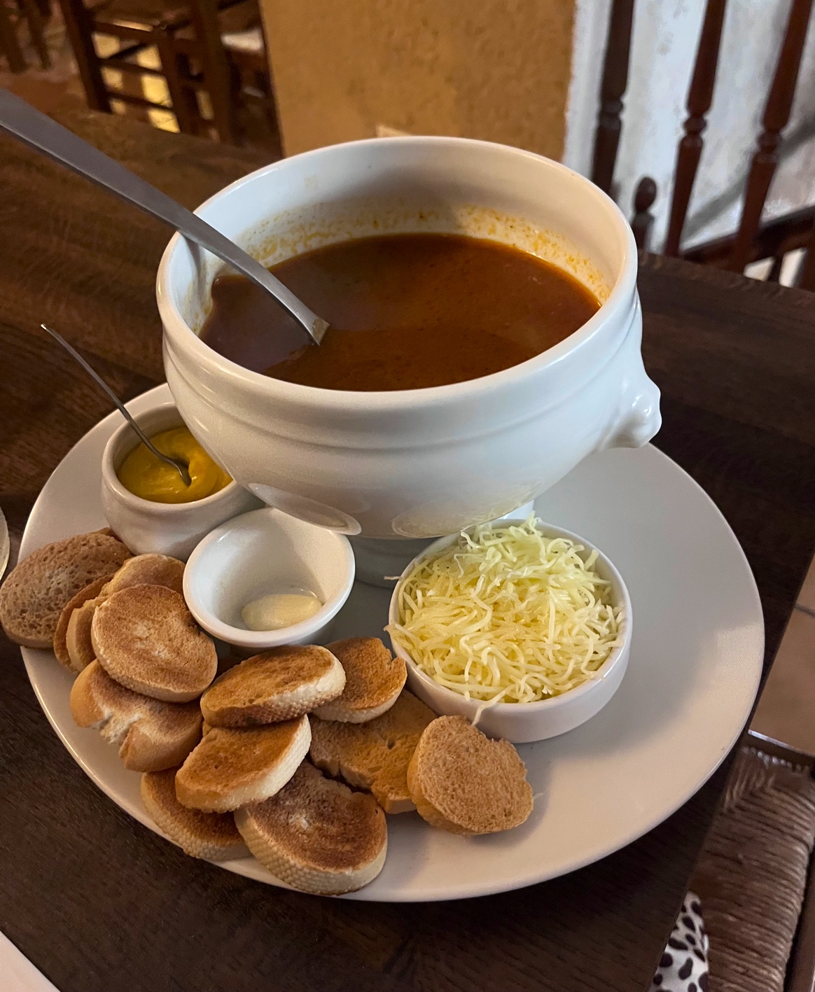 Restaurant au centre de Piana offrant une carte variée. Soupe de poisson servie en quantité.