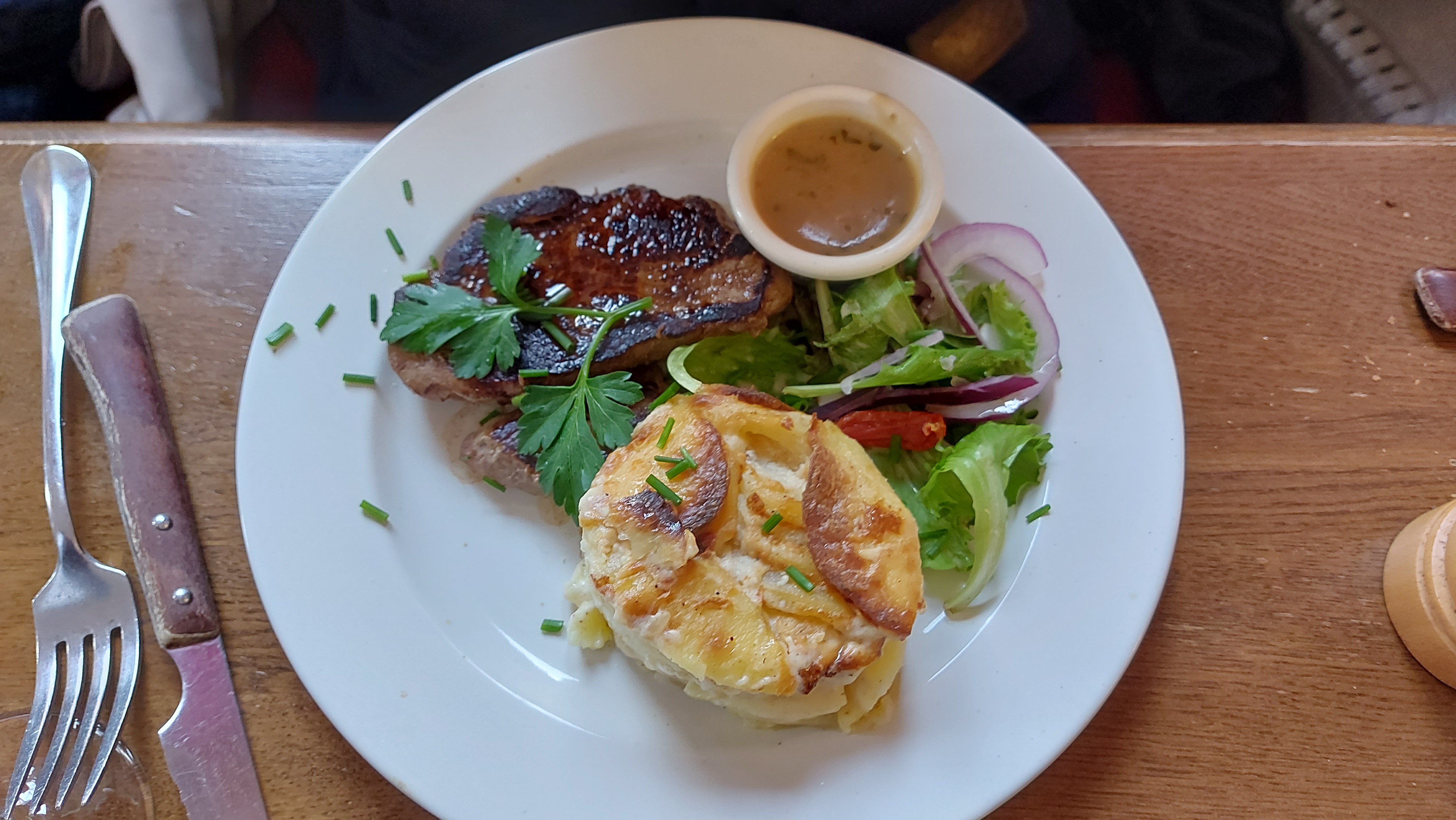 la carte et le cadre donne envie, mais dans l'assiette c'est très décevant. Le menu du midi est ridicule, plats à la carte nul. J'ai pris en entrée une soupe à l'oignon : servi sans fromage, on aurait dit un vulgaire bouillon viandox. Mon collègue, une entrée à la carte à 9 euros pour une salade thai ridiculement petite et sans intérêt. Puis j'ai continué sur les rognons, mal cuisinés, une sauce sans goût, seul l'écrasé de pomme de terre etait valable. Une côté de porc a la fermière ultra plate, supposé acheté au meilleur prix. bref un très mauvais rapport qualité prix pour une note à 60 euros à deux sans dessert.