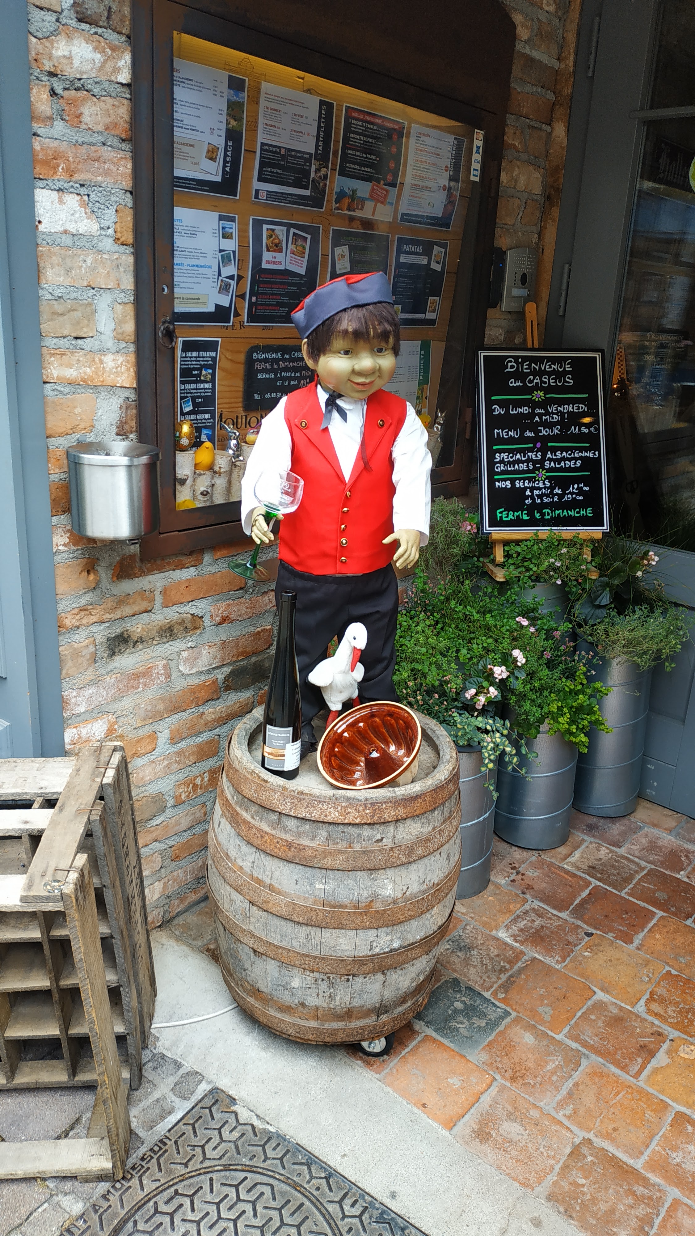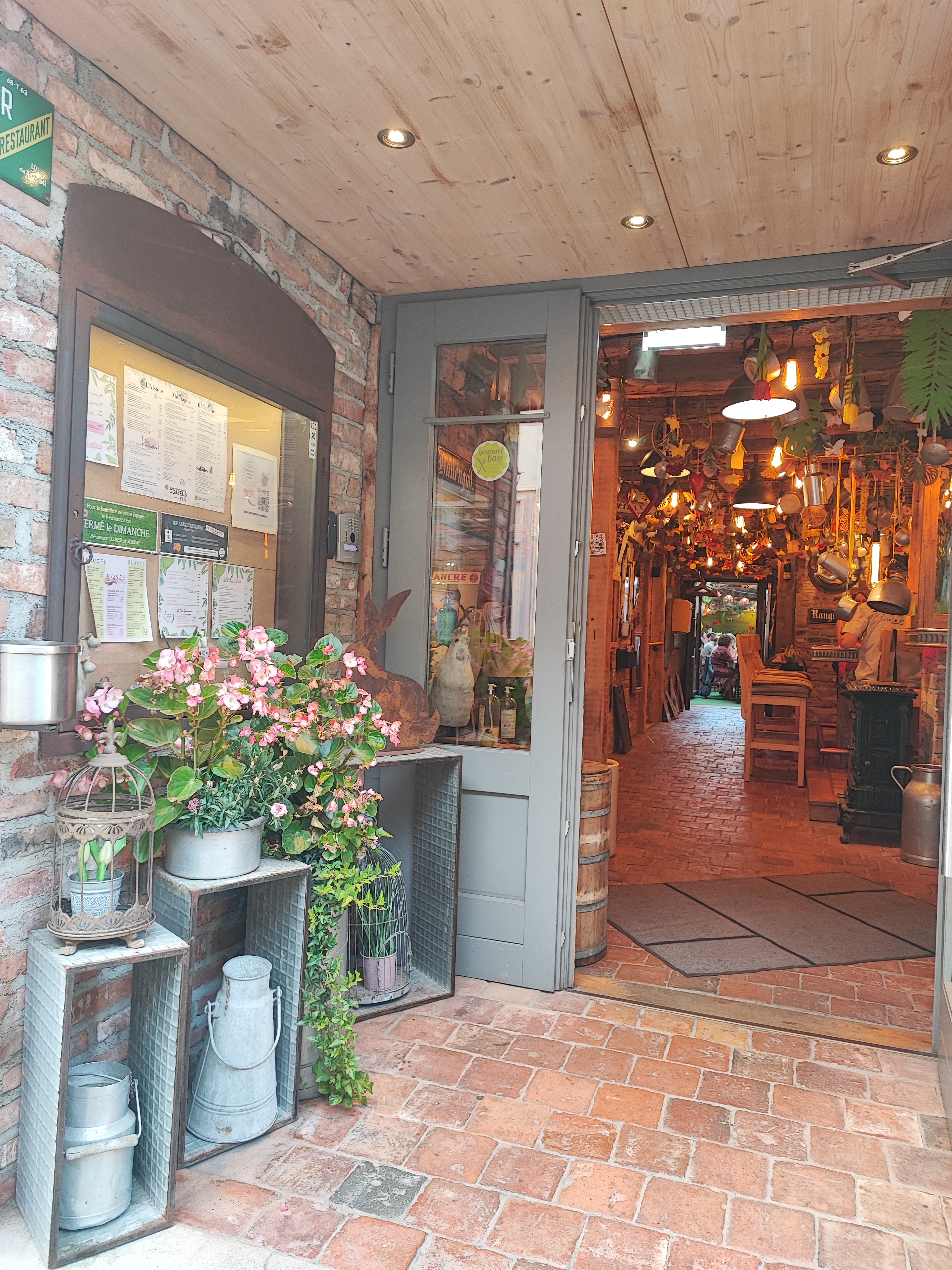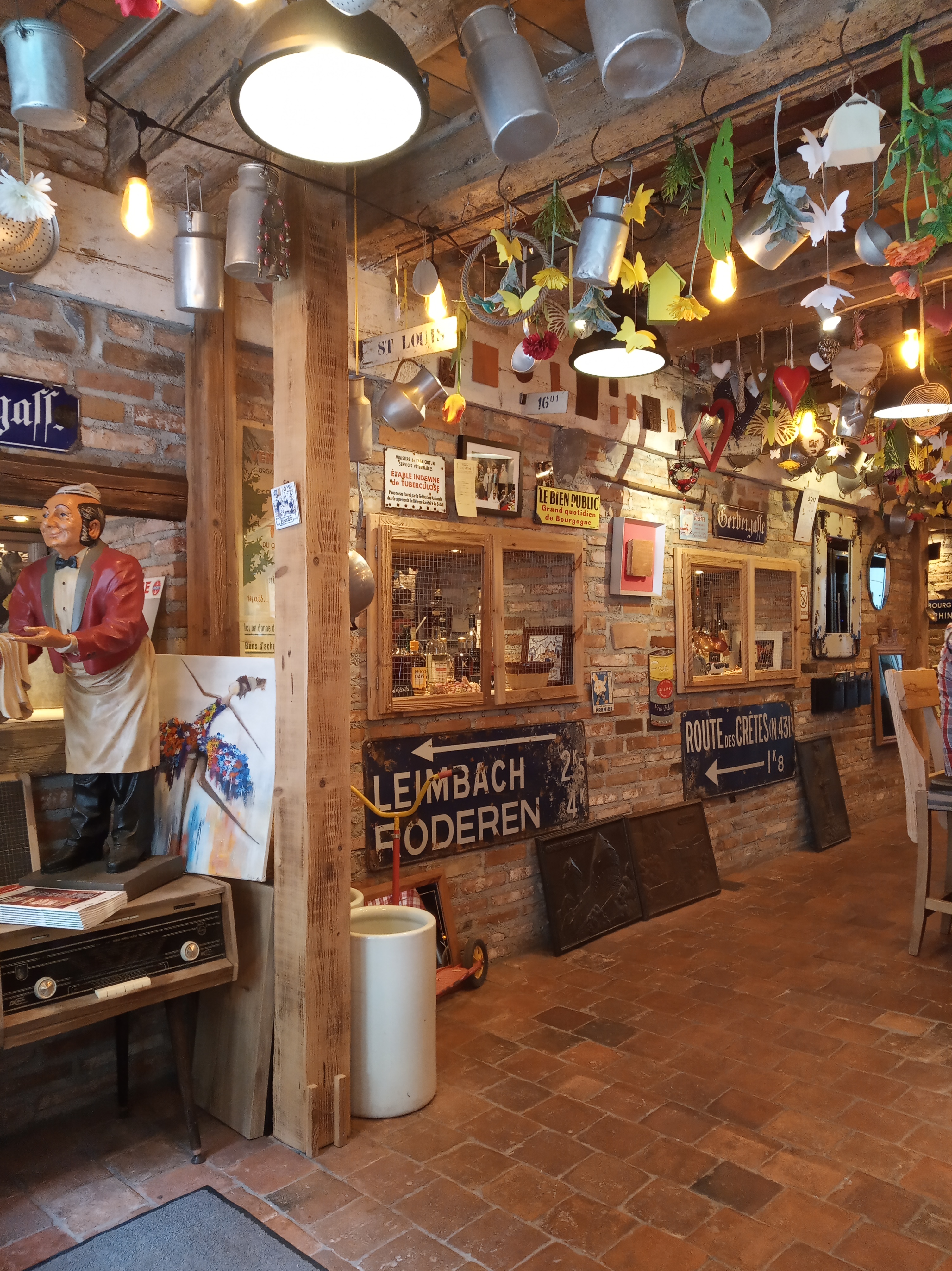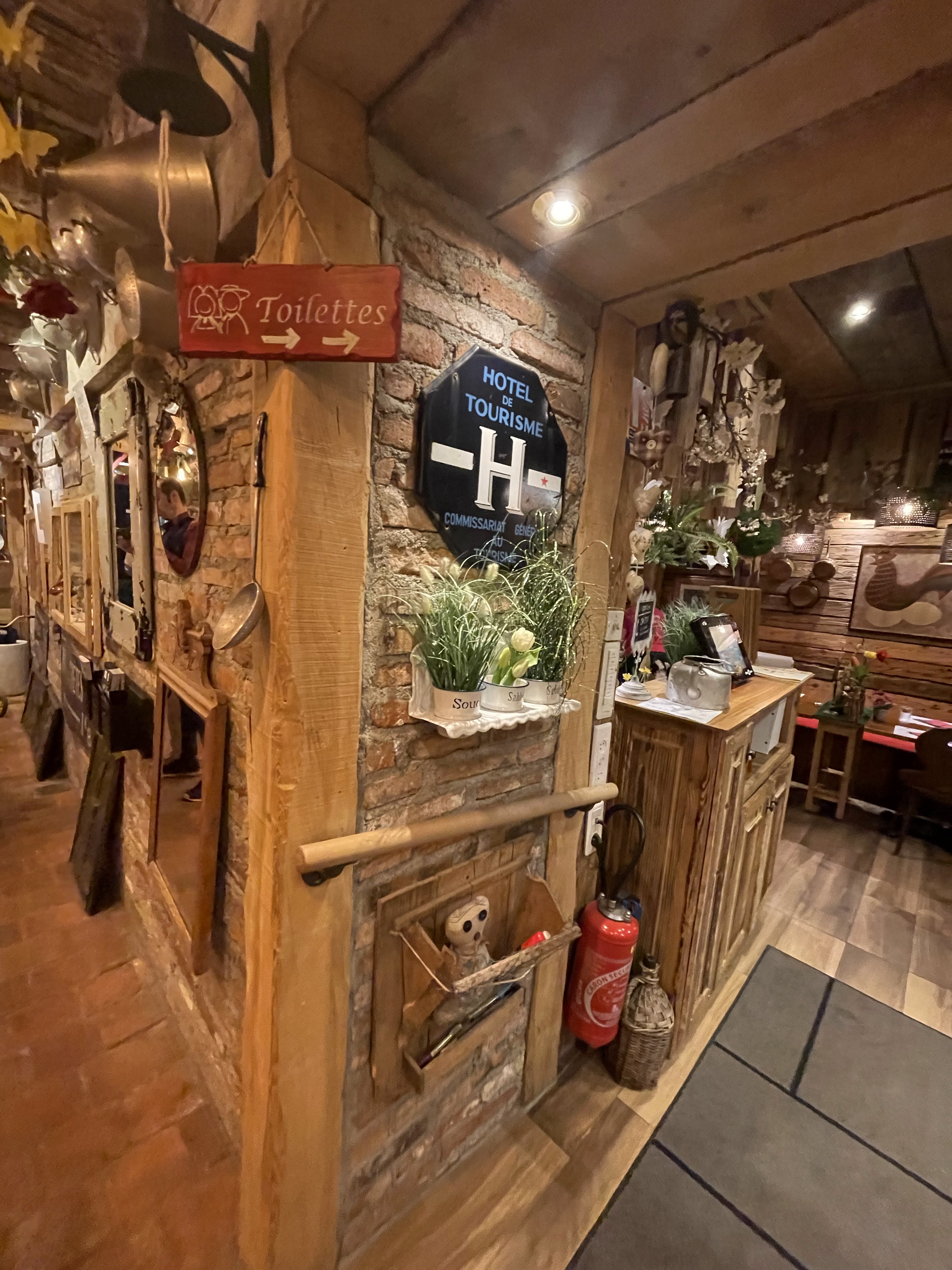 Nous voulions manger dans un restaurant de terroir alsacien avant de retourner dans les Vosges, nous avons hésité entre l'auberge des Franciscains (beaucoup d'attente pour être servi apparemment...) et ce restaurant bien noté sur Maps et TripAdvisor mais moins typique à premier vue. Et bien, quelle surprise ! Nous avons adoré ce restaurant ! Déjà parce que la décoration est vraiment unique, il y a beaucoup de choses à voir, des fleurs, des coeurs, des objets anciens, des outils de la ferme et j'en passe... Le tout est harmonieux et propre, on voit que le restaurant est bien entretenu. Même les toilettes sont originaux, vous serez surpris en allant vous laver les mains. Ensuite, l'ambiance est très agréable, l'accueil par le personnel a été impeccable, le sourire, l'accompagnement à une table, la prise de commande rapide, un passage de la serveuse en cours de repas pour savoir si tout allait bien, la carafe d'eau toujours pleine, 10/10. De la musique des années 80 en fonds sonore (Macumba, Partenaire particulier, Confidence pour confidence...), ça ne peut que mettre de bonne humeur. Et enfin les plats, la choucroute royale à 22€ était délicieuse, pommes de terre et choux en bonne quantité mais surtout bien garnie en charcuterie et de la charcuterie de qualité ! Ni trop grasse, ni trop salée, au top, juste comme il faut. La bière brune a bien accompagnée ce plat, pour un dîner typiquement alsacien. Nous avons passé un très bon moment et nous conseillons aux touristes ce restaurant qui est en plus à côté d'une église magnifique. Bonne continuation.