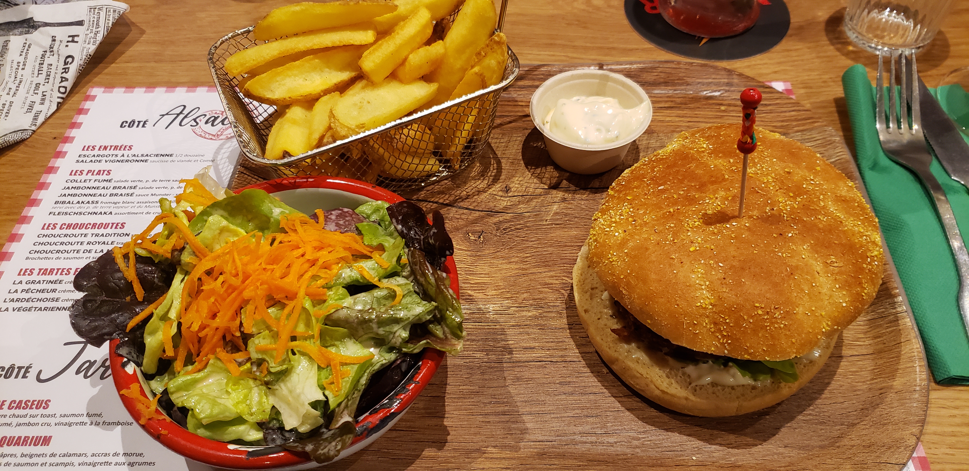 Intérieurs très mignons et paradis culinaire. La carte propose de nombreuses options différentes liées à la tradition alsacienne mais aussi des burgers et des salades. Délicieux! Un conseil : réservez votre table à l'avance et vérifiez les toilettes, super intéressant le système d'eau au niveau du lavabo.