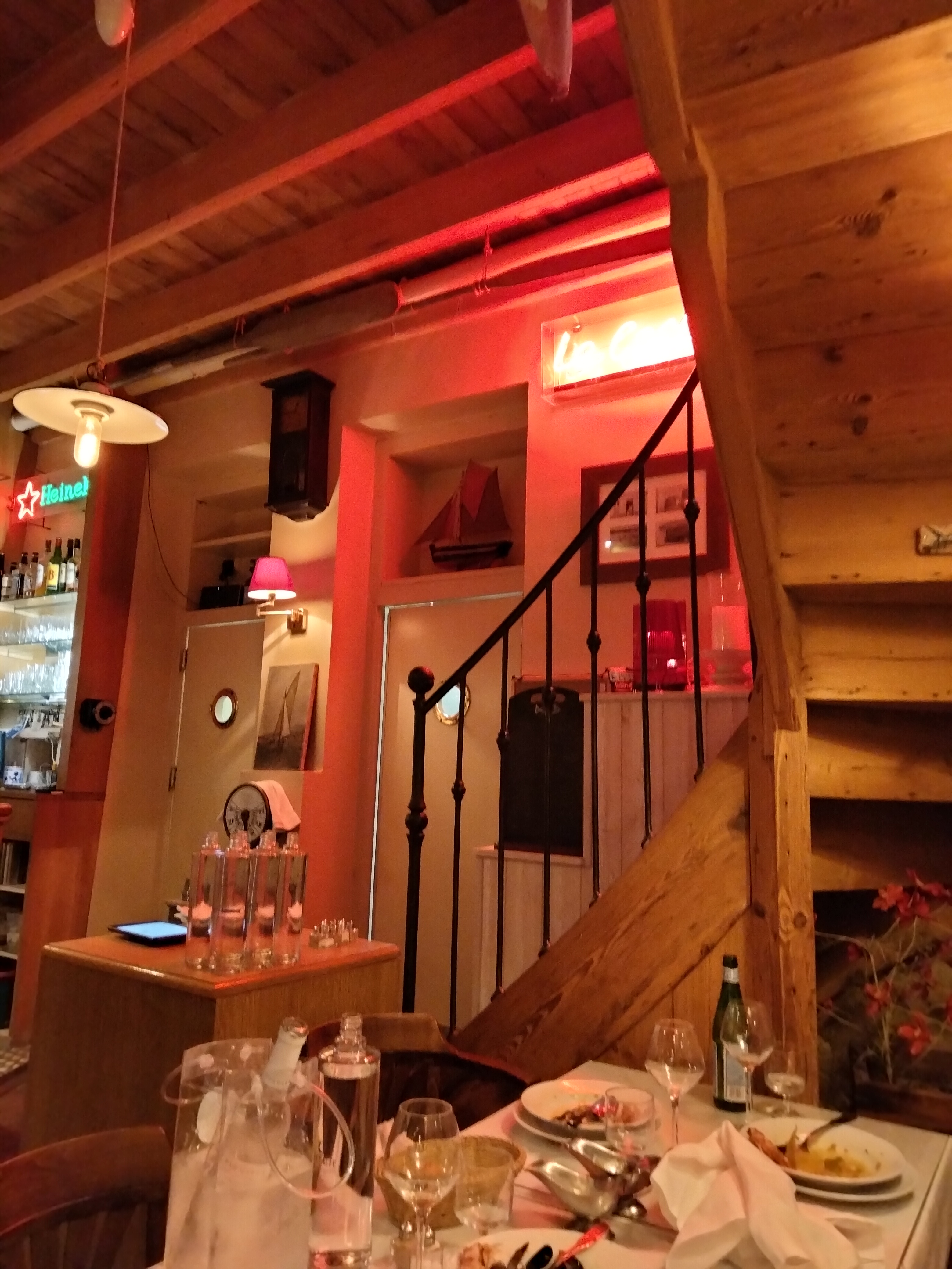 Dans un décor charmant, composé d’objets de marine, de boiseries anciennes, sous un éclairage tamisé de petites lampes rouges, nous avons passé une très agréable soirée. La musique de jazz d’ambiance était maintenue à faible volume (contrairement à de nombreux restaurants qui imposent une musique braillarde). Nous avons dégusté une excellente soupe de poisson, puis de très bonnes moules marinières, accompagnées de frites véritablement maison, enfin de délicieux desserts, tiramisu et mousse au chocolat. Il s’agit d’une cuisine authentique et sans prétention, très savoureuse, à base de produits frais de très bonne qualité. De plus, le serveur était très aimable. Tout était donc parfait. Excellent rapport qualité-prix.