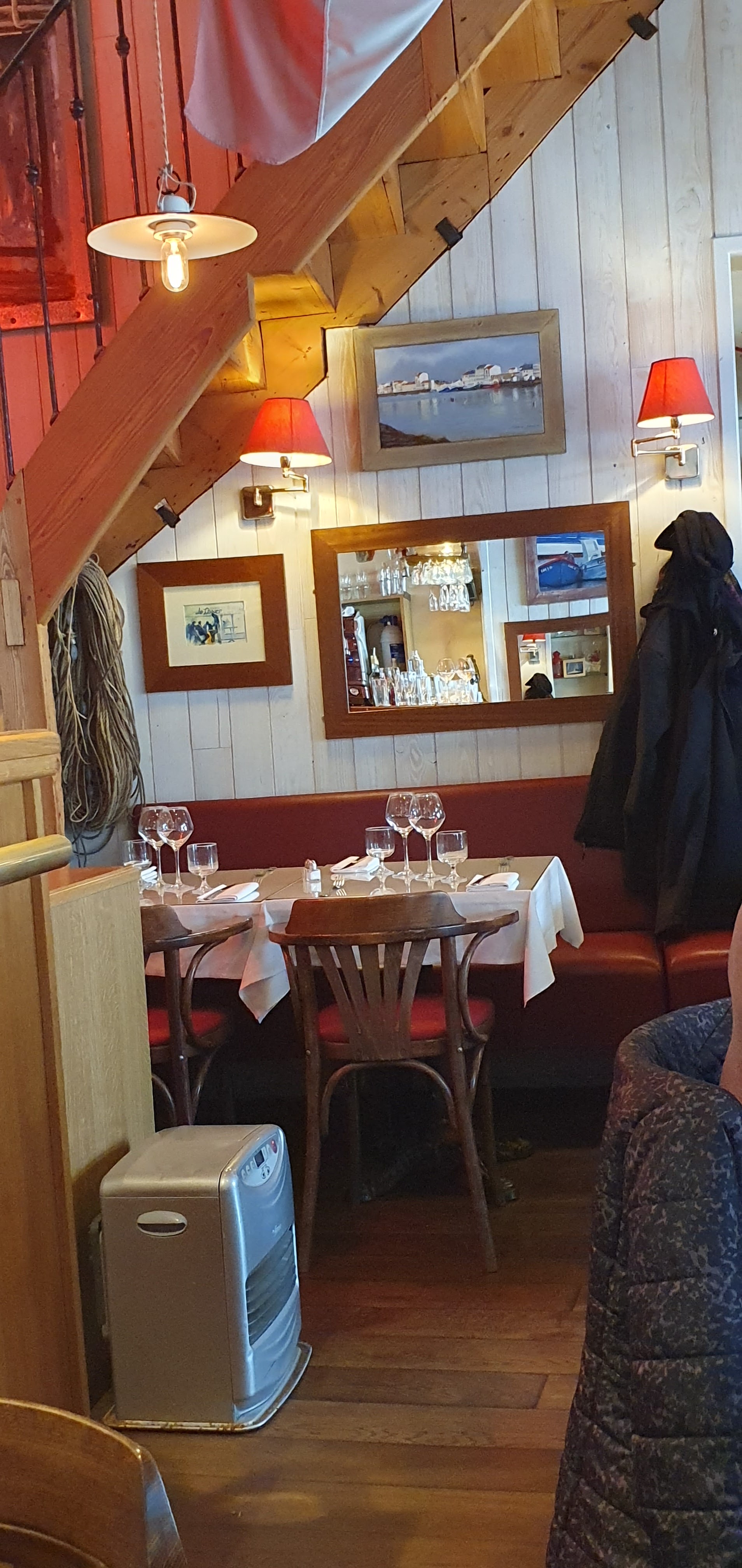 Joli cadre, un mélange de nappe à la française et babioles sur le thème de la mer En terme de proximité c’est correct même si peu intime. Petite ambiance musicale et assez calme quand le restaurant n’est pas plein Moule marinière à prix abordable (ne provenant pas du port, information donné par le serveur) Serveur à l’écoute et répondant au besoin. J’ai réservé pour le soir même. J’en ai eu pour approximativement 20e avec plat, boisson et thé