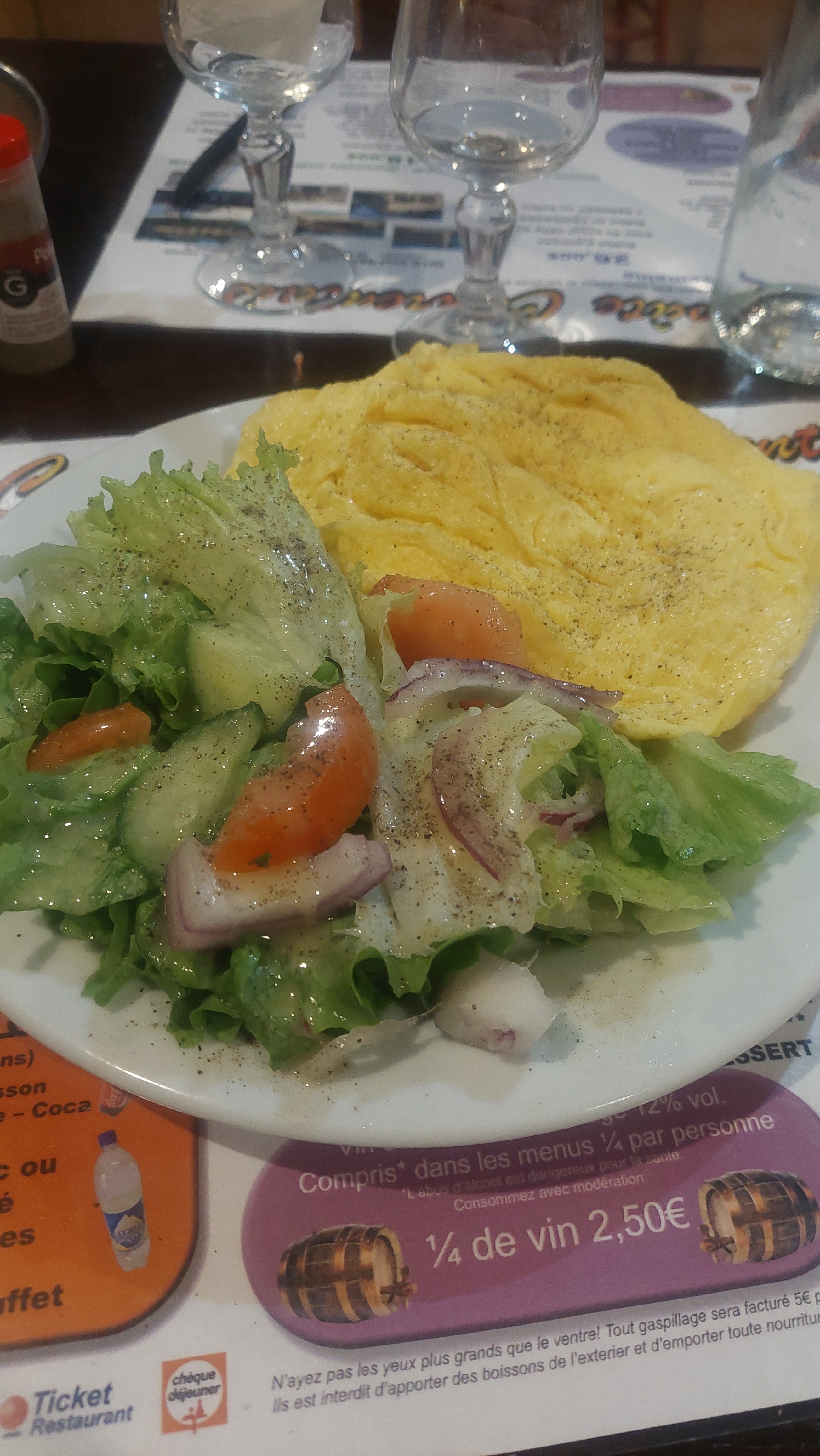 serveuse gentille. cadre moyen. eau plate servi sur la table pas bonne, idem pour le vin qui est servi en carafe. demandé plat du jour où il y avait une sauce barbecue, une fois l'assiette arrivée à table la sauce dans le plat n'était pas au barbecue mais une sorte de bourguignonne a un goût bizarre. ma fille a voulu des pâtes avec du gruyère,résultat elle a tout laissé dans l'assiette car le gruyère était périmé. et d'après la serveuse il ne faut pas faire ce genre de remarque car sinon le cuisinier à la pression. attention aux glaçes certaines date dépassé et il faudrait penser à décongeler de temps en temps le frigo ou se trouve les glaces. je ne recommande pas du tout. déçu.