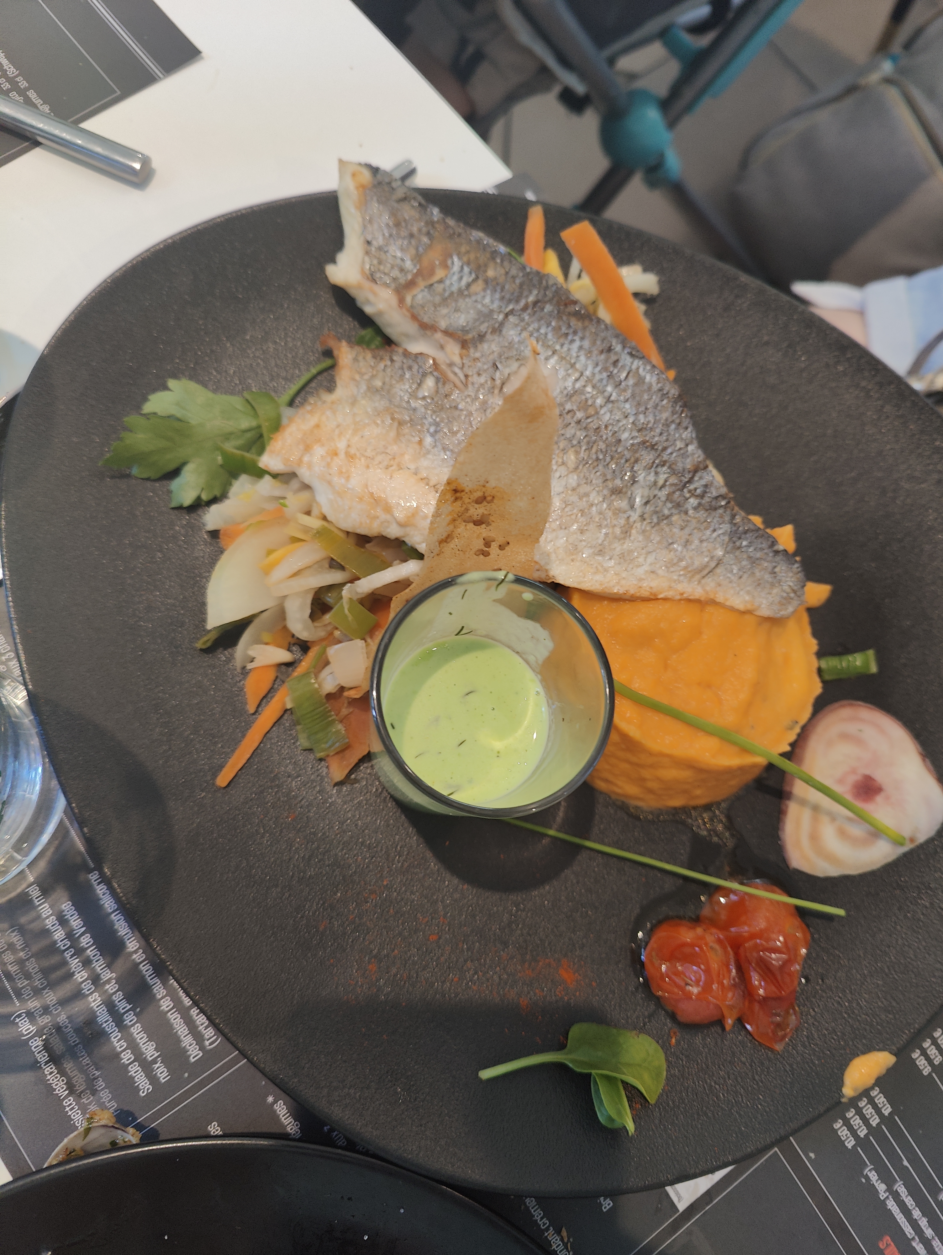De l'entrée au dessert nous nous sommes régalés, un poisson avec ses légumes superbement assaisonné. Le cadre, le service, la cuisine. Tout y était. 5/5. Je recommande.
