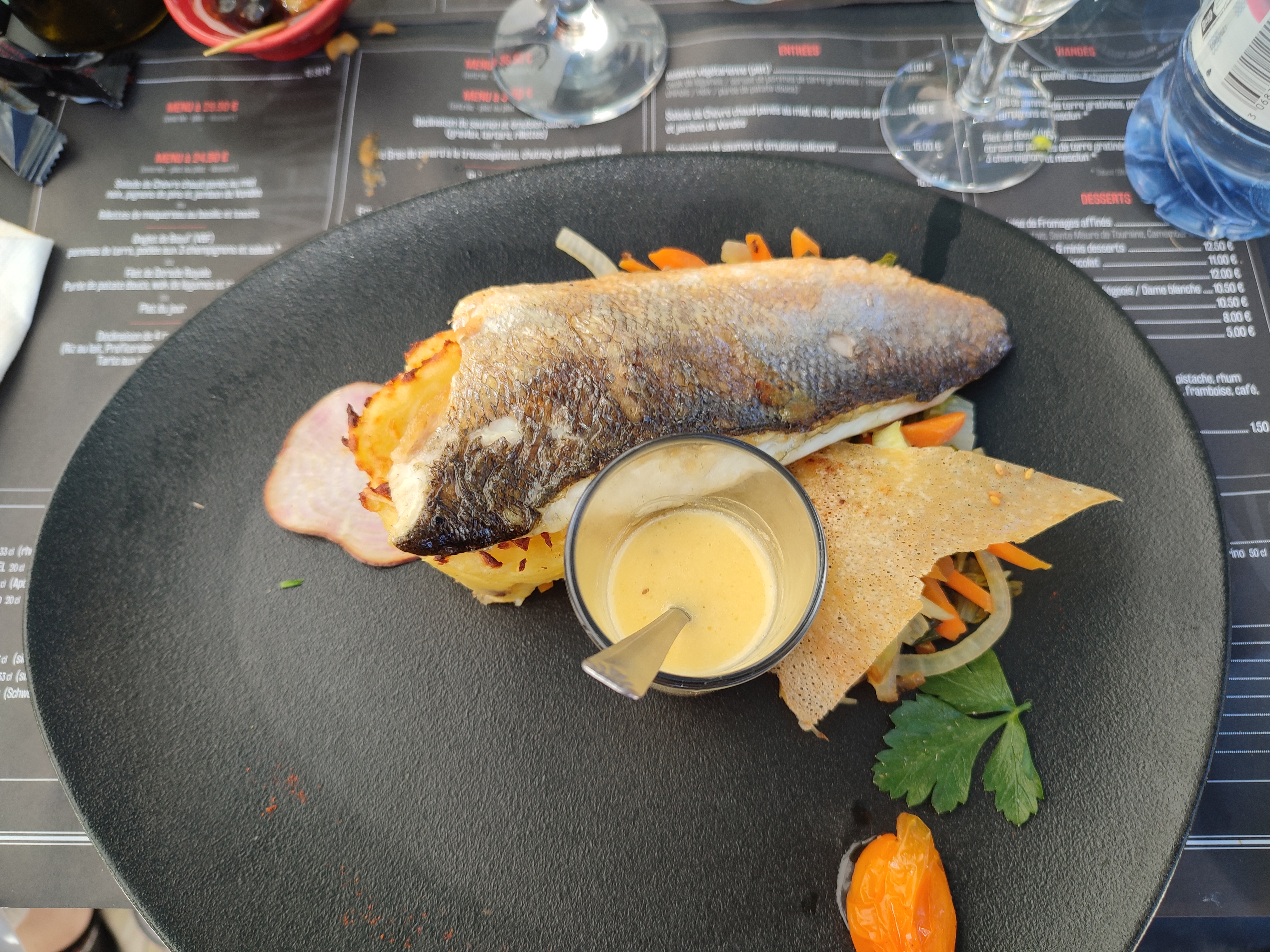 Grande salle moderne avec jolie vue sur le château. Acceuil froid.. mais finalement tres gentil. Jolie assiette de fruits de mer à partager à deux. Filet de bar impeccable. Les noix de Saint Jacques délicieuses.....néanmoins a 21€ à la carte, les trois saint jacques et demi vous laissent un goût amer cf photo. 5 ou 6 jacques sont un minimum pour ce type de resataurant à la carte. Menetou Salon délicieux. Globalement bonne adresse à conseiller.