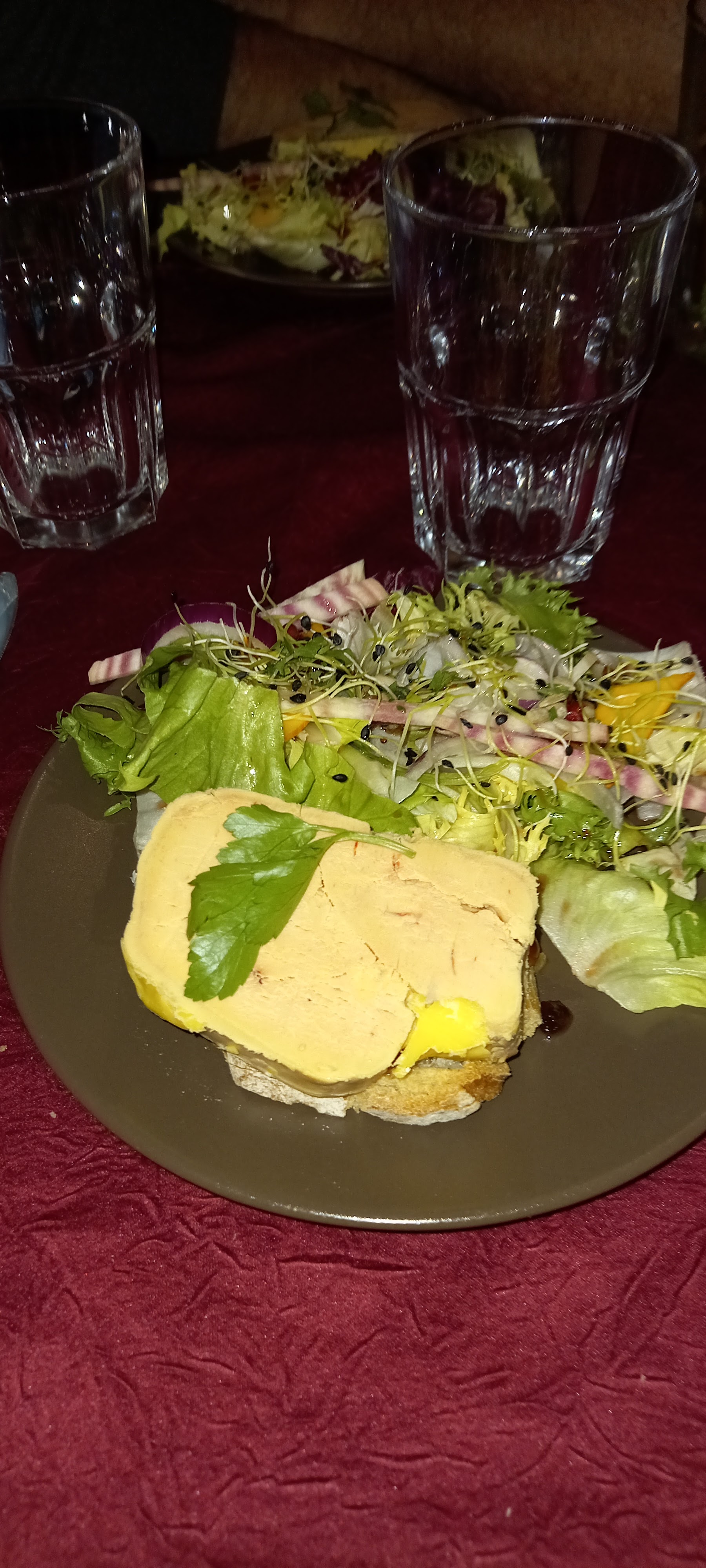 Déjà accueil désagréable Nous avons failli repartir à peine installés Dès que l on interpelle un ou une serveur (se) on se fait rembarrer Salade copieuse mais baignant dans l huile , pas de saveurs . A fuir il y a f de autres restaus dans cette charmante cité