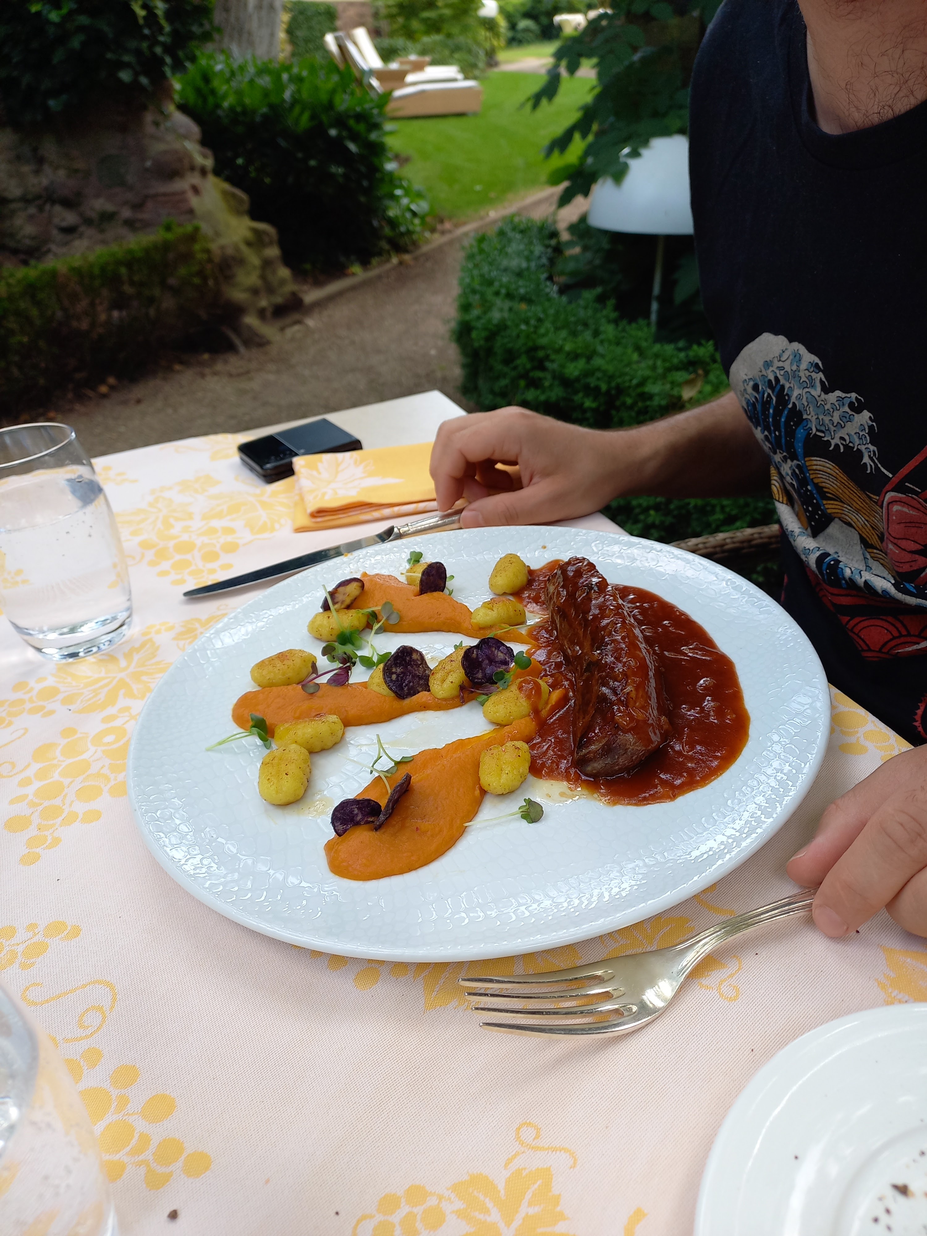 Très belle expérience, nous sejournions à l hotel a la cour d Alsace pour notre séjour de noces, et le repas était très raffiné, (menu Hermann à 5 plats), les mets excellents, et le cadre extérieur très romantique avec un service très courtois sans être pompeux ou oppressant, le canard était cuit à la perfection, merci à toute l équipe,