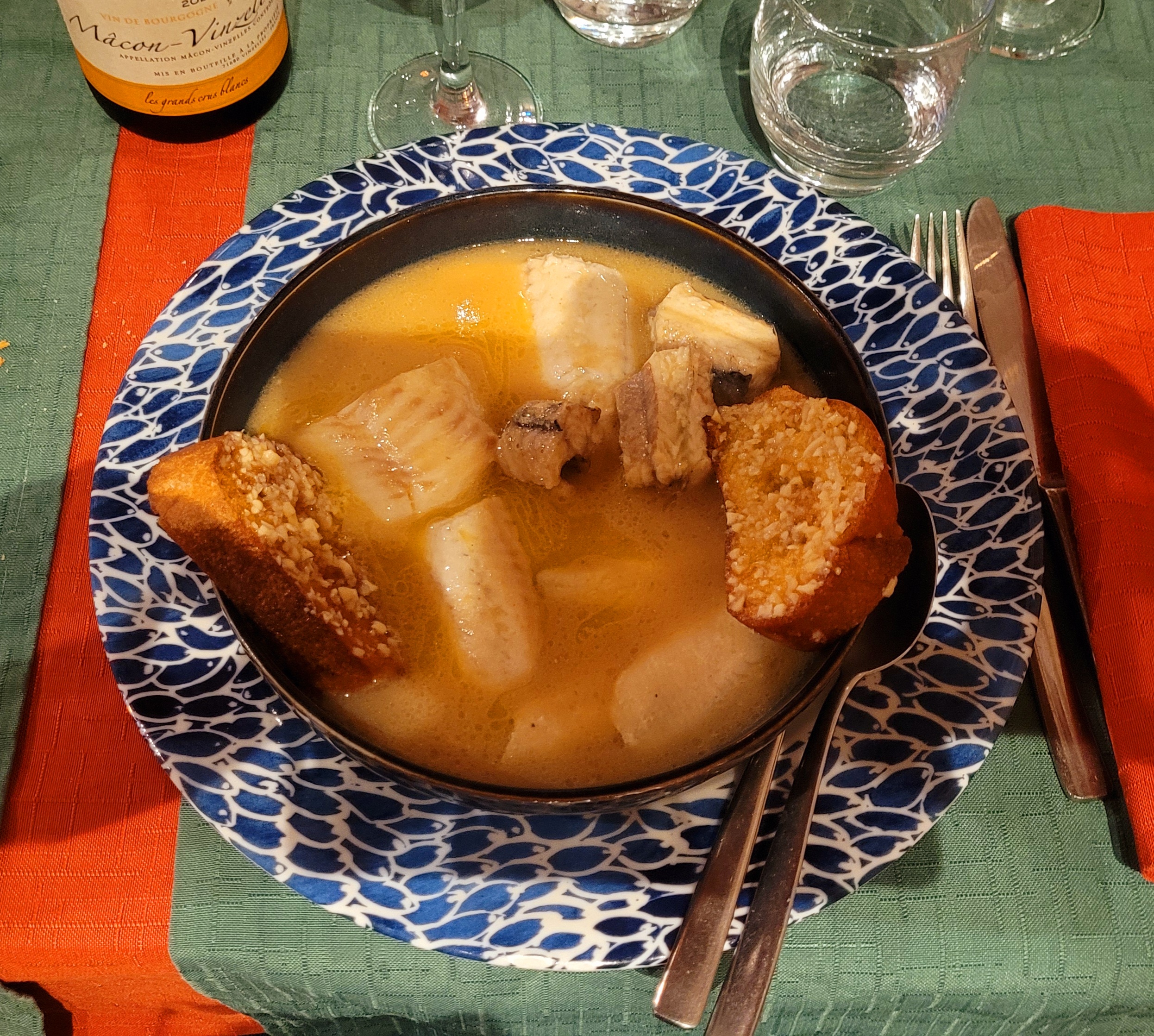Nous avons mangé une pochouse qui est une spécialité du pays faite avec des poissons fins de rivière genre bouillabaisse bourguignonne mais bien meilleure que la spécialité du pays du soleil hahaha !accompagné d'un excellent vin blanc de Bourgogne c'est un menu que nous recommandons la note réglée avec des chèques vacances et monnaie rendue sur l excédant félicitations !