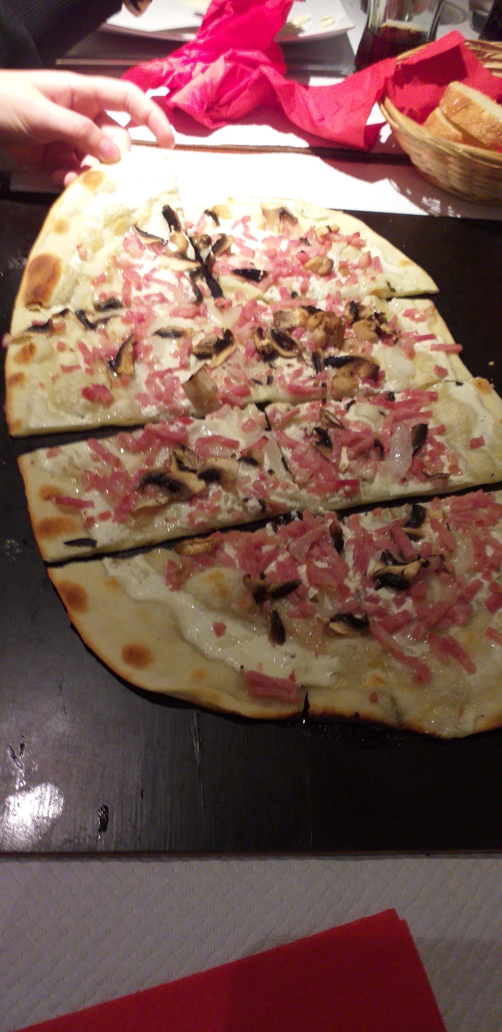 Très bonne tarte flambée et bien garnie. Pâte de Tarte flambée faites maison. Très bon dessert maison. Je recommande.