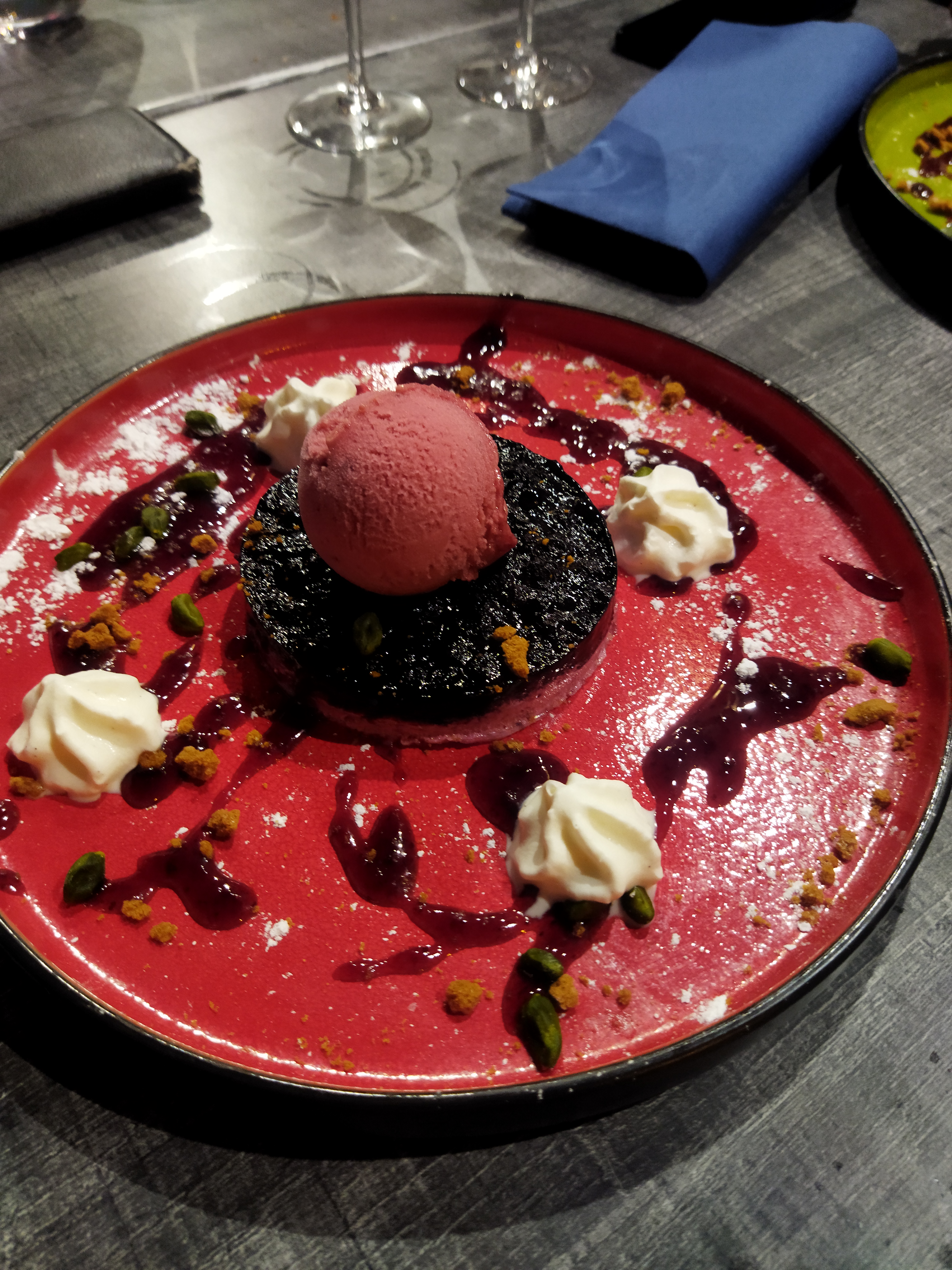 Repas original mélange mer et viande. Très bon et servît rapidement !!! Le seul reproche pour moi c'est le service !!! Pas fini de manger, la serveuse vient débarrasser... Et après le dessert on nous débarrassés les verres pour nous faire comprendre de partir. Personne pas souriante du début jusqu'à l'encaissement. Sinon cadre magnifique et original !!!