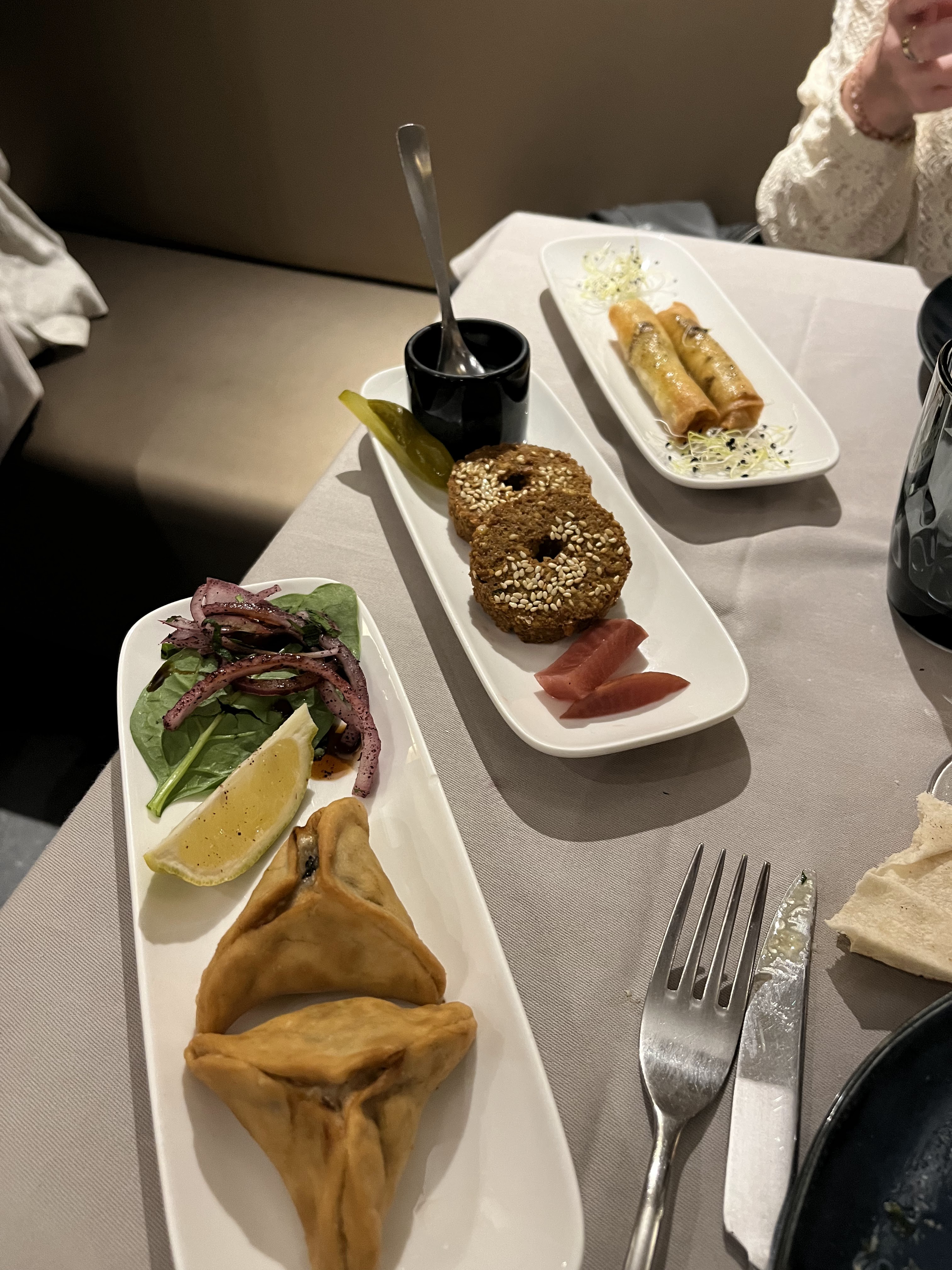 Nous avons pris à emporter car malheureusement le restaurant était complet. Il y avait des mezze chauds et froids ainsi que des minis brochettes(3 menus extra) . C'était excellent et copieux. Nous nous sommes régalés. La prochaine fois, on réservera plus tôt.