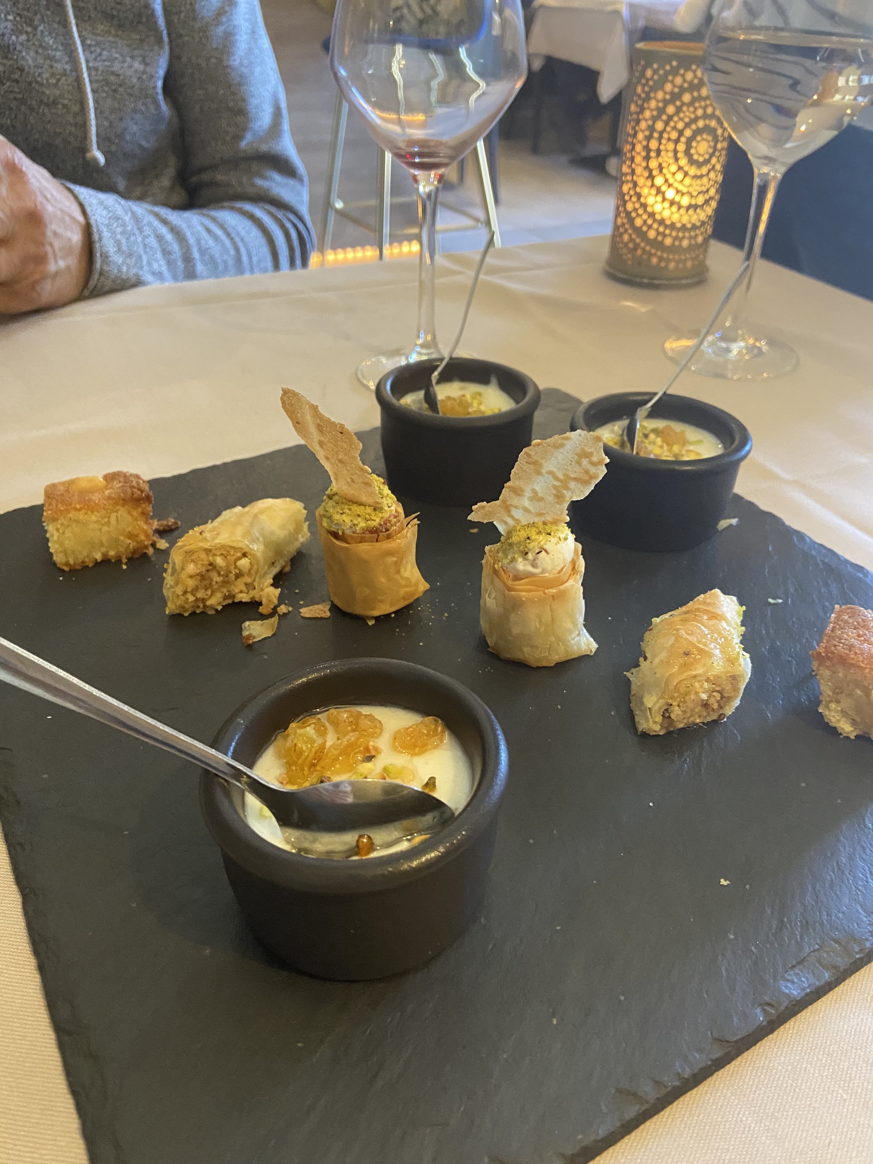 Excellente soirée avec un service impeccable et une nourriture divine, mon épouse n’aime pas le humous d’habitude, mais le vôtre elle l’a apprécié énormément. Bravo et merci beaucoup pour cela. Le dessert 🍮 était parfait particulièrement la spécialité du chef 👩🍳 Salutations de Strasbourg et de Copenhague (København) / Danmark