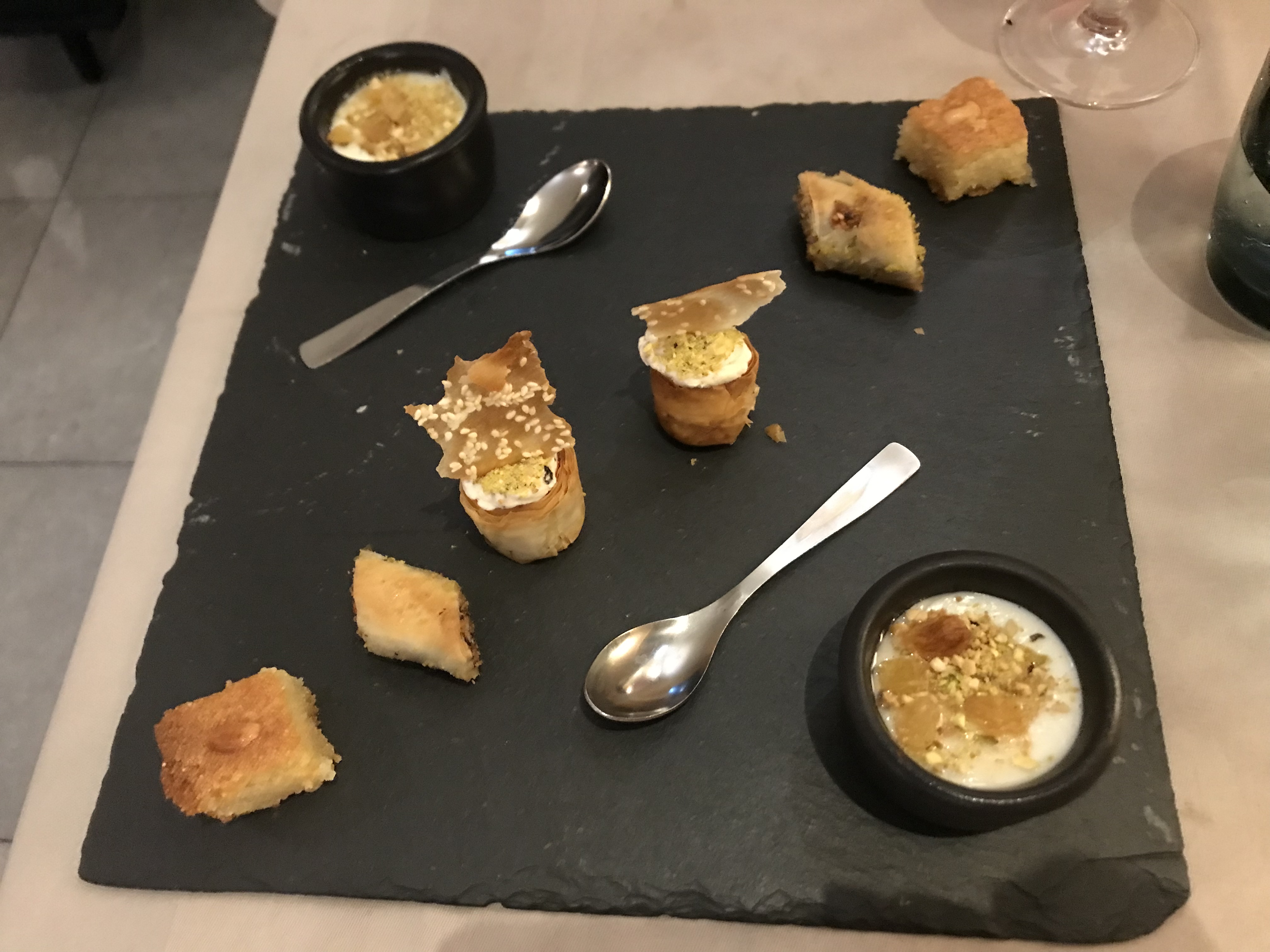 Restaurant libanais qualitatif, belle décoration très épurée et lumière tamisée. Apéritif kir libanais à la rose. Menu découverte en 4 temps. Bien assez en quantité. Possibilité d'avoir un plat unique pour enfant (brochettes poulet et kefta avec du riz). Dessert maisons (makrout, baklava, flan pistache et dessert signature). Je recommande!!