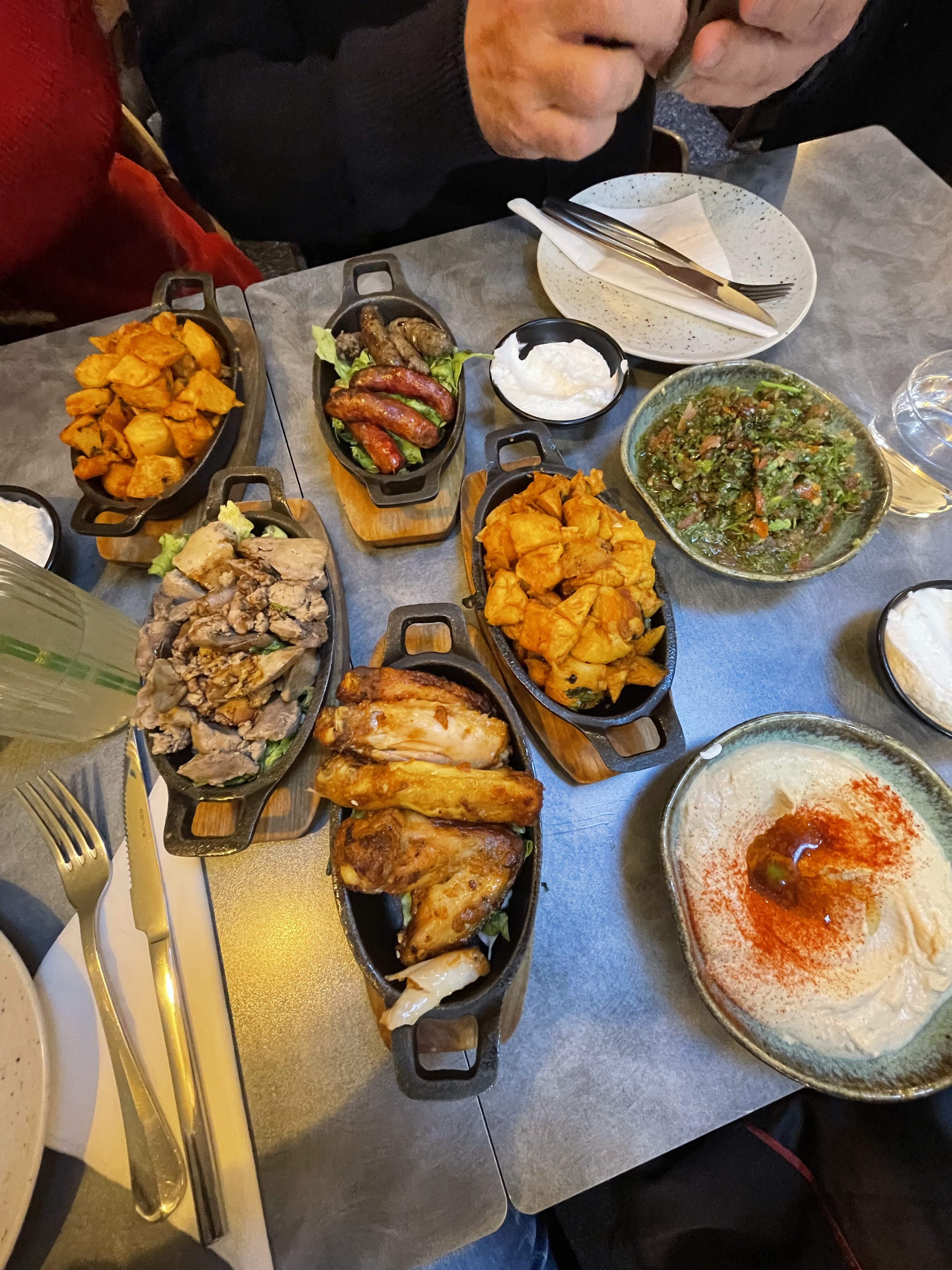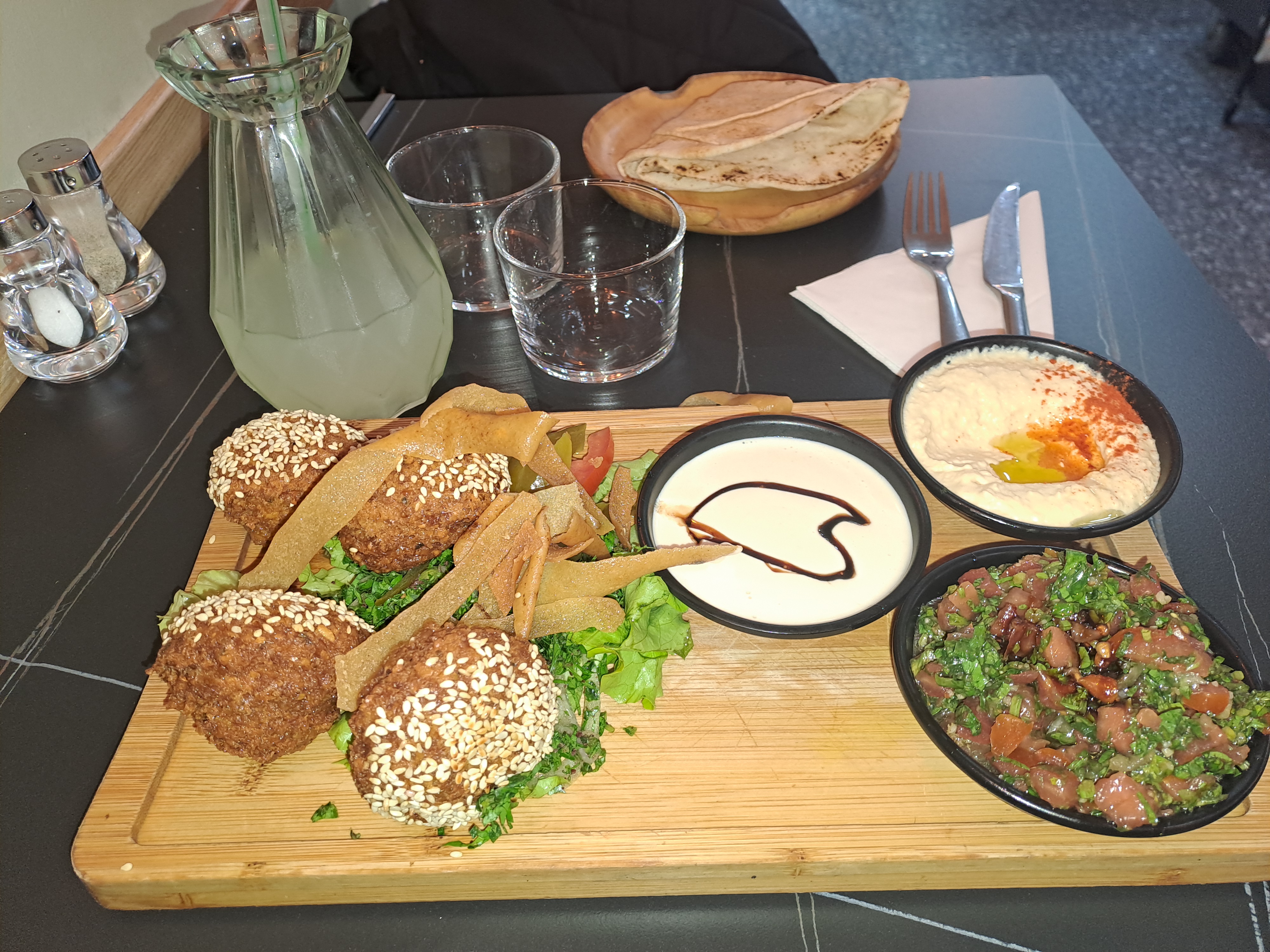 Ma première fois dans un restaurant Libanais. Un très bon accueil, n'y connaissant rien du tout le serveur très agréable nous à expliqué comment sont préparées les assiettes. Depuis longtemps j'ai toujours voulu goûter des falafels. Et je ne suis pas déçu. C'est très bien assaisonne, épicé juste ce qu'il faut. Le houmous est super. La petite salade est fraîche. J'ai adoré le petit plus a la fin, le petit verre de thé.