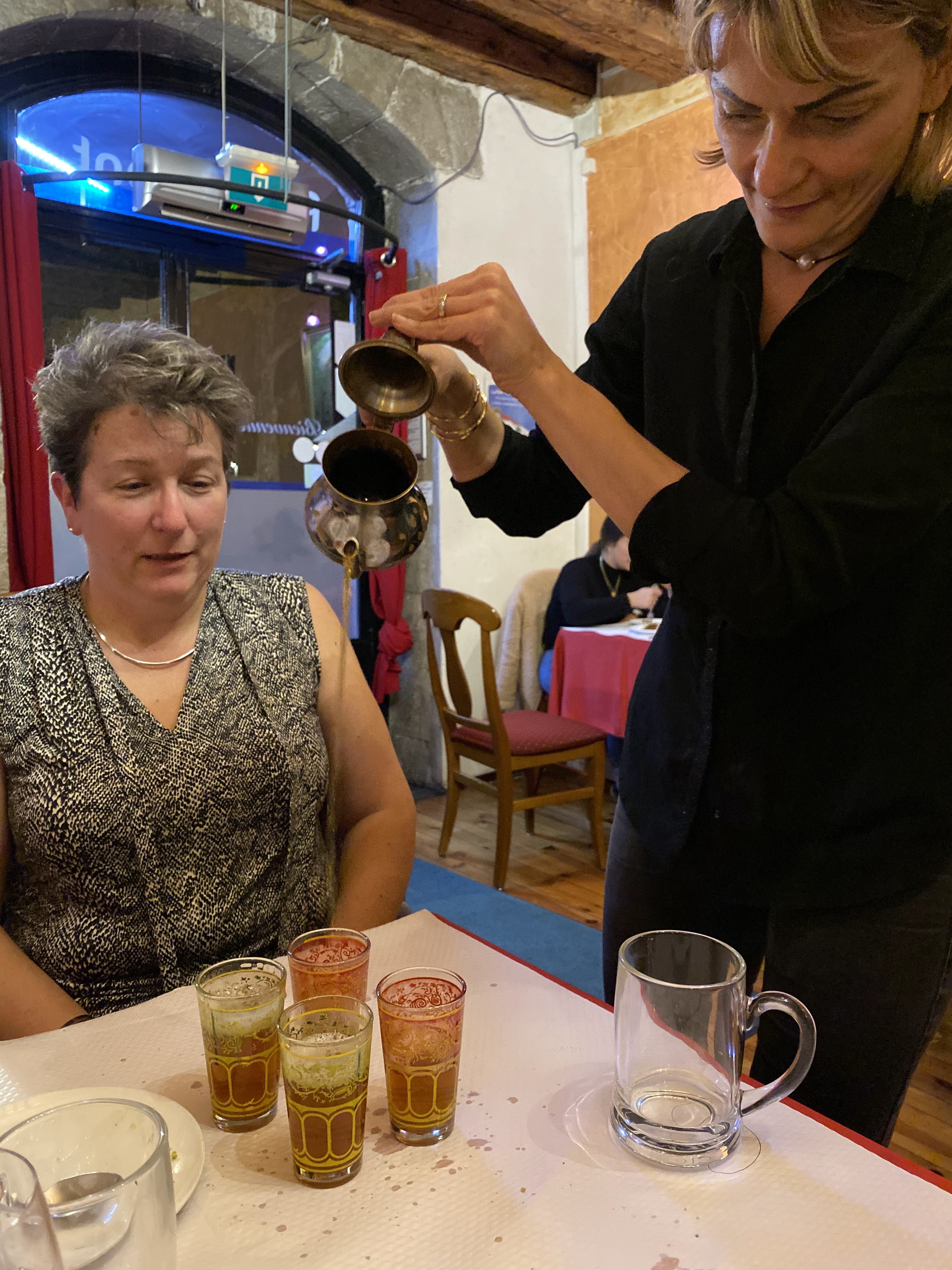 patronne un peu directive mais aussi très chaleureuse, bonne ambiance assez calme , petite musique d ambiance, plat très très bon, brochette de viande fondante. repas découverte à 27 euros assez copieu.