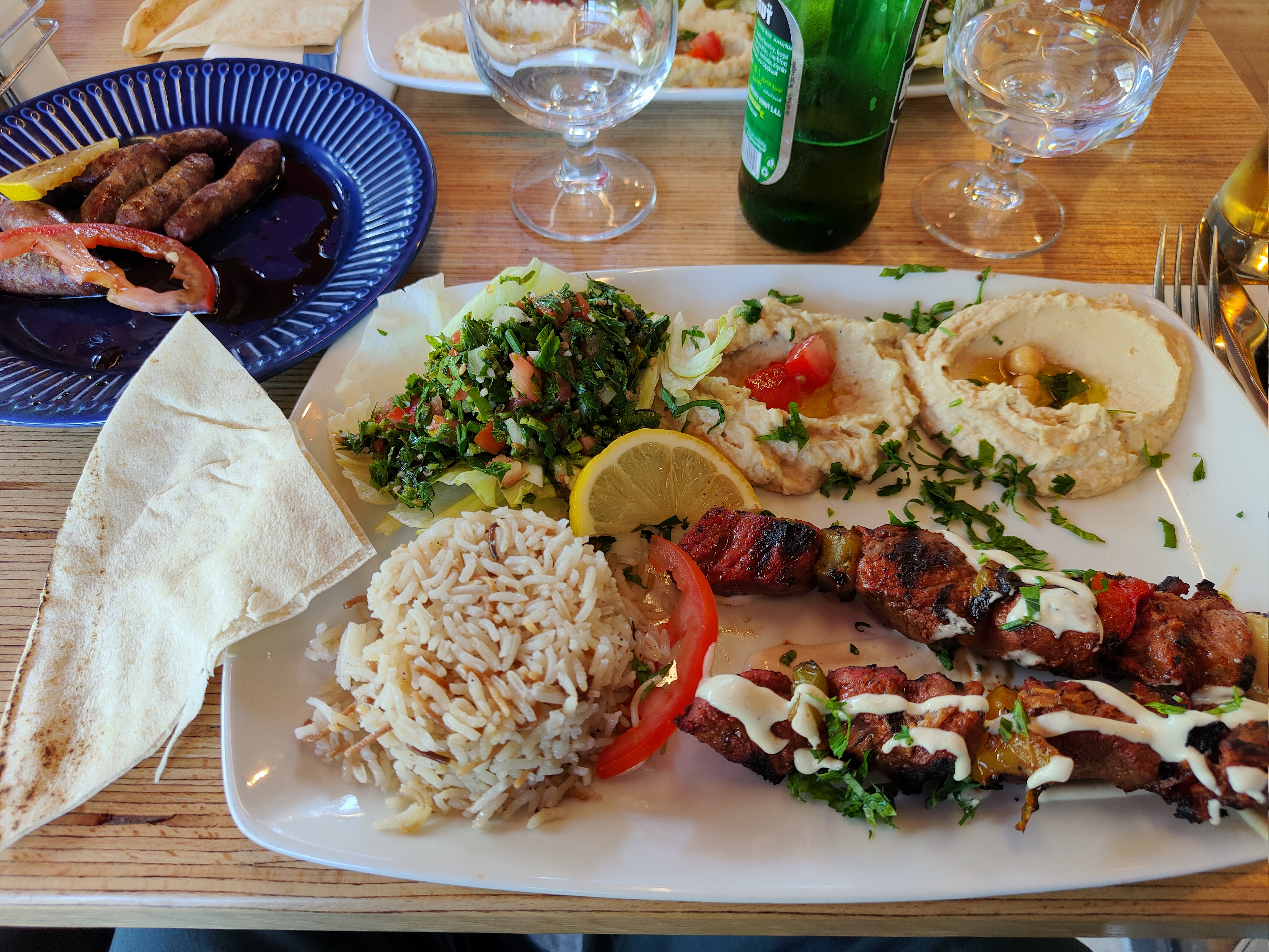 Très bon restaurant libanais. Les Brochettes d'agneau sont excellentes. Les petites saucisses citron épicées sont délicieuses. Terrasse sympa à l'ombre et service très agréable.